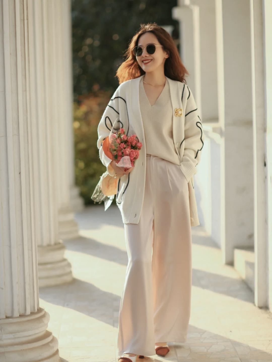 顯瘦幹練的闊腿褲,搭配軟糯的毛衣隨意慵懶,日常通勤穿也完全OK~