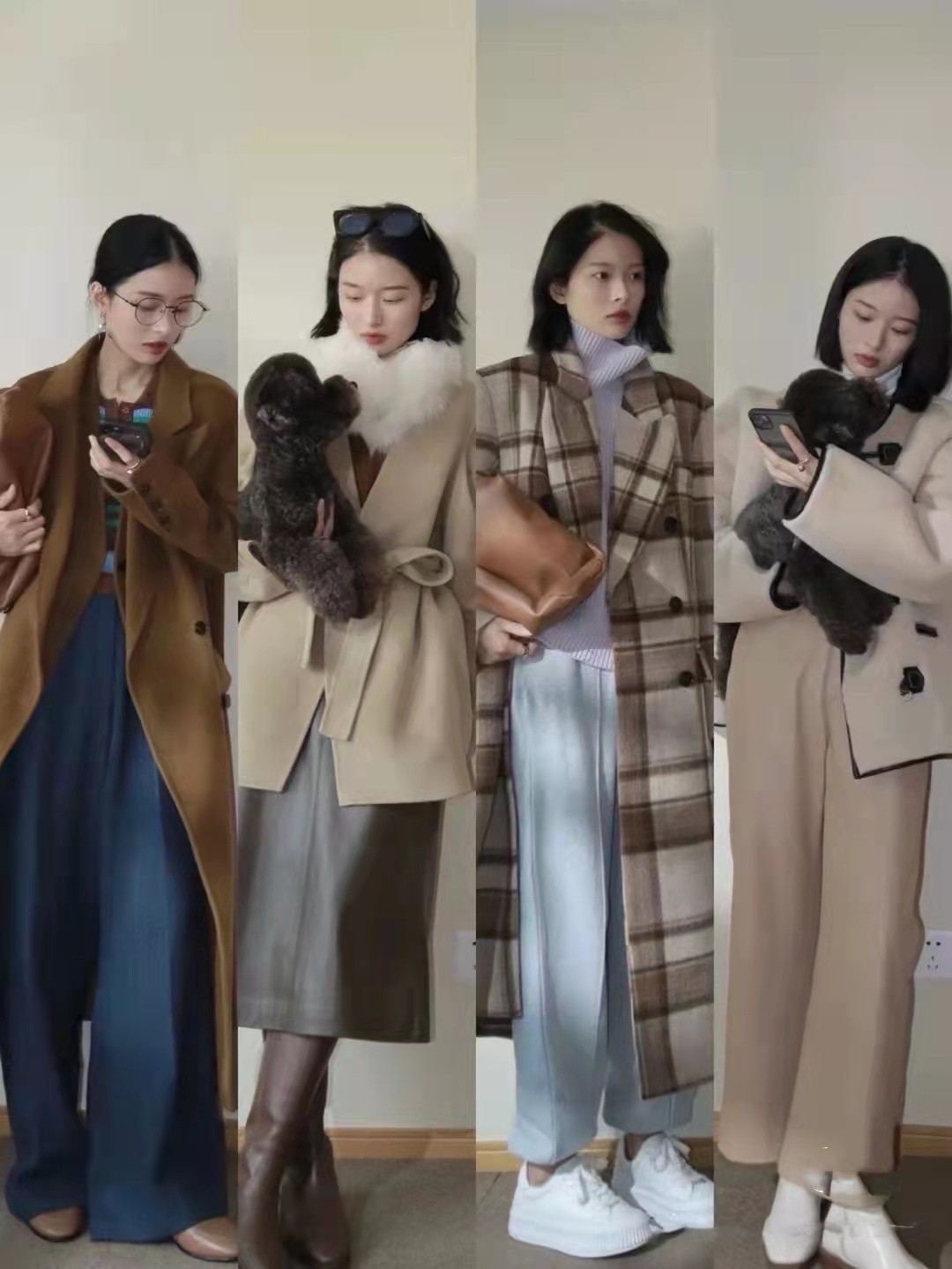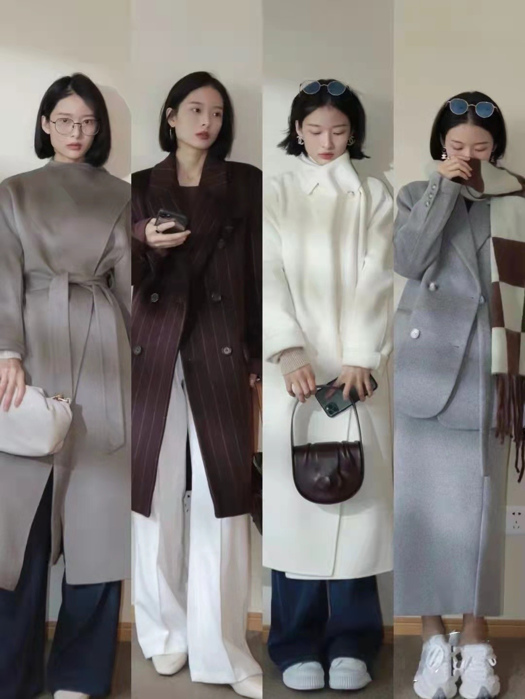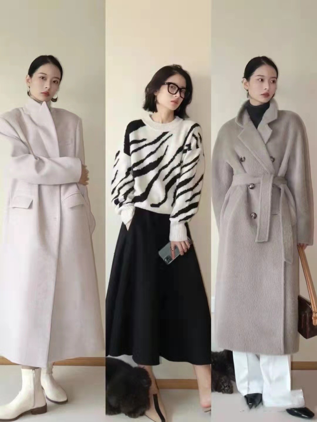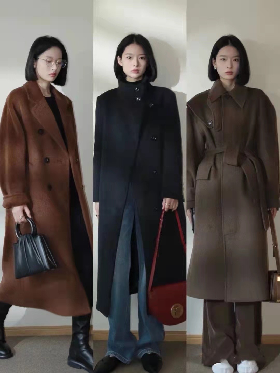 選用褲子主打版型,就是十分寬鬆,遮肉感那是很不錯。至於長度上,恰好到達腳踝位置,擋住寒風。如果穿著半身裙,可以用長筒靴來修身,算是一種經典的穿搭。大衣有不少經典單品,像棕色、米色等,搭配很不錯。