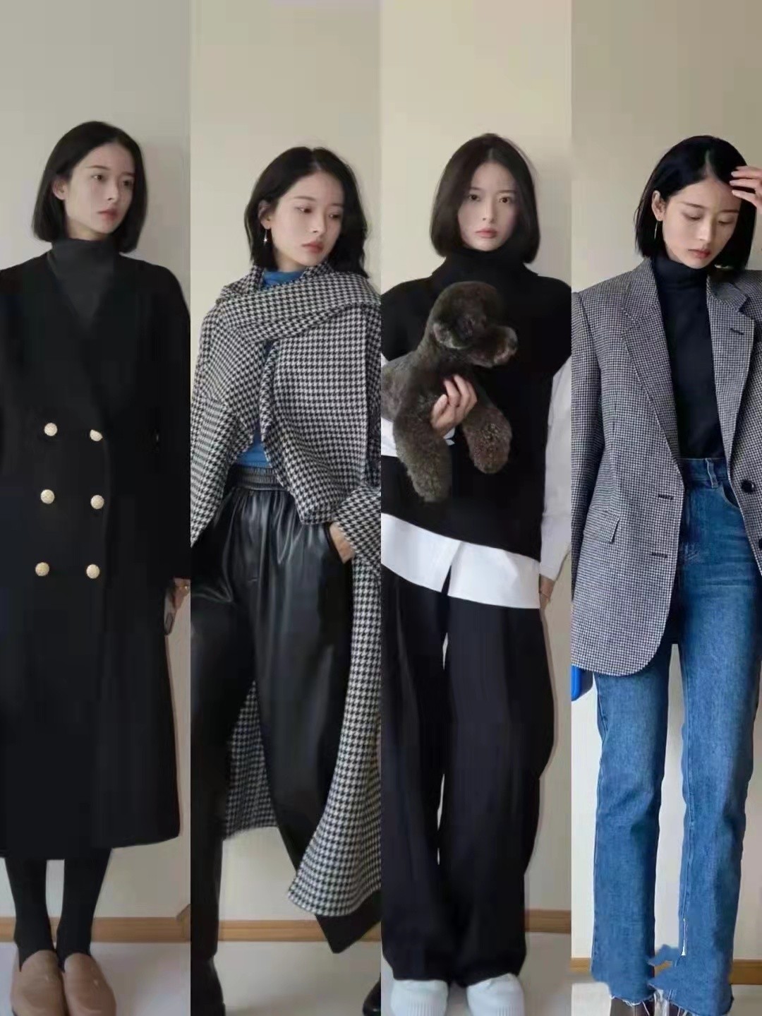 這次博主選擇穿搭上,進行大膽嘗試,給人一種青春活力感。像九分牛仔長褲搭配格紋西裝,帶來一種清新感。還有黑色皮褲,可以和不規則格紋大衣組合,那是很洋氣。黑色雙排紐扣大衣,不妨和黑色打底褲來搭檔,氣質上那是十分幹練。