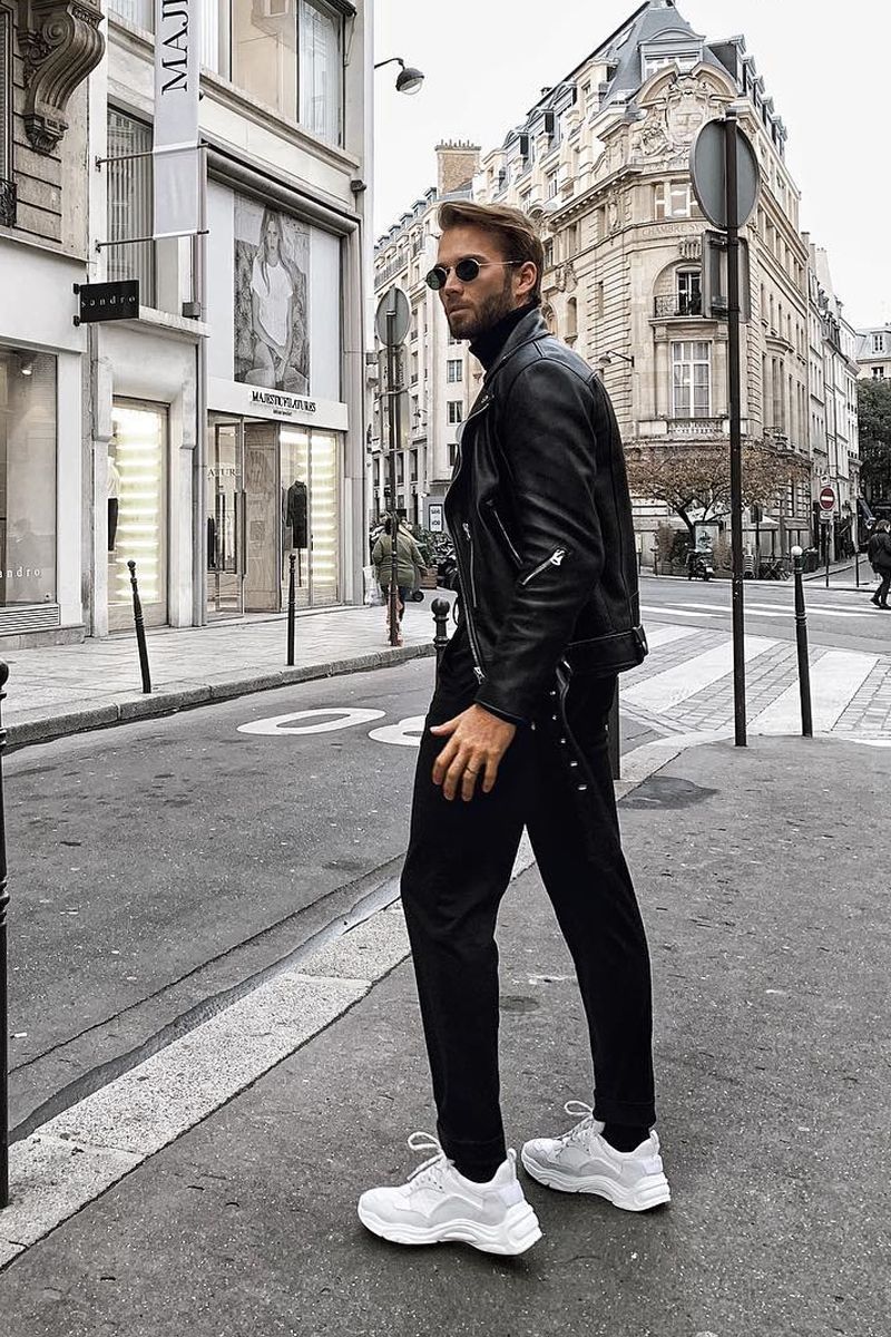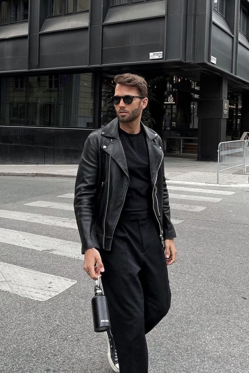 當然,在冬季裡選擇黑色皮衣的另一個原因,還是來源於它的材質。要想使冬季造型擺脫沉悶厚重,這種帶有硬挺感、線條十分利落的材質就能夠輕鬆做到。簡單幹練的線條讓整個人看起來氣場大增,呈現出十足的男人味。
