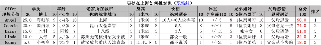 但是,自從我這2篇標誌性文章發表後,《男孩如何挑老婆?》《在大城市找什麼樣的男孩為好?》,很多人就套用我如下這樣的表,來給對象打分了。