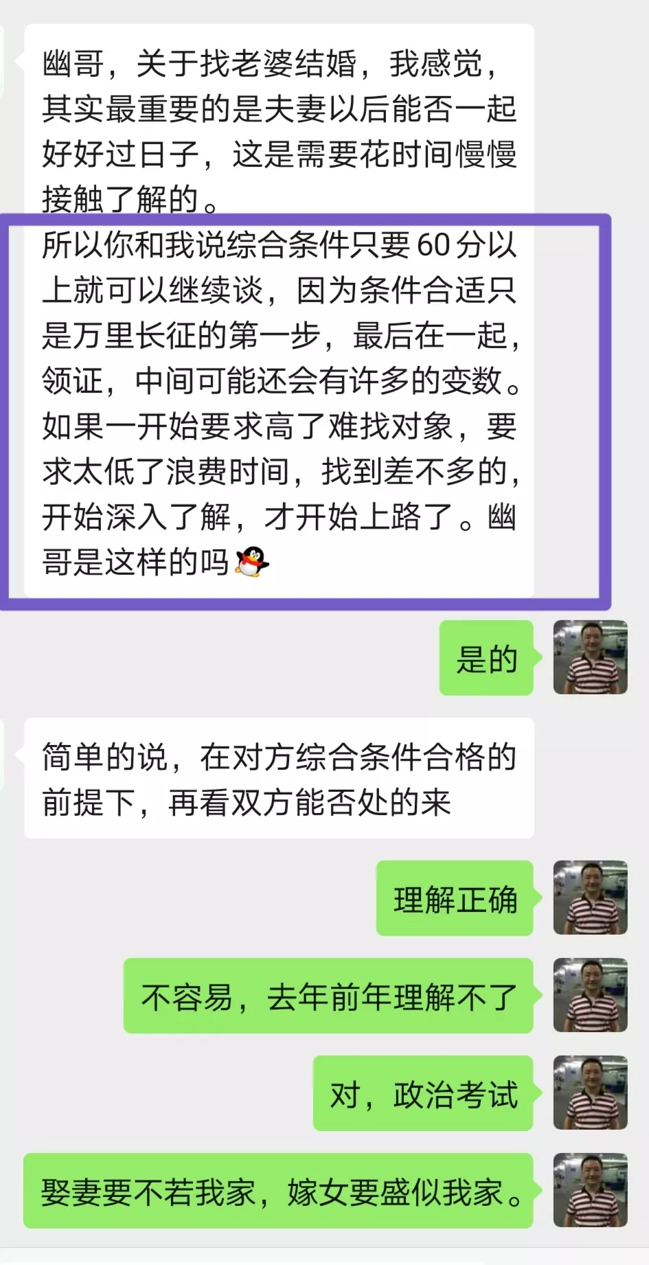 你看如下小華,他就是在一線城市有房產工作尚可的情況下準備找對象,在多次向我提問後,他才終於理解了今天我要講的內容和道理。你也認真看下框出來的內容,下圖。他制定的標準是60分,類似政治考試的分數。