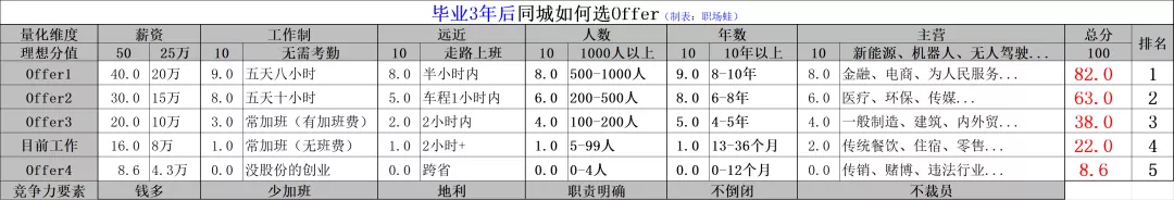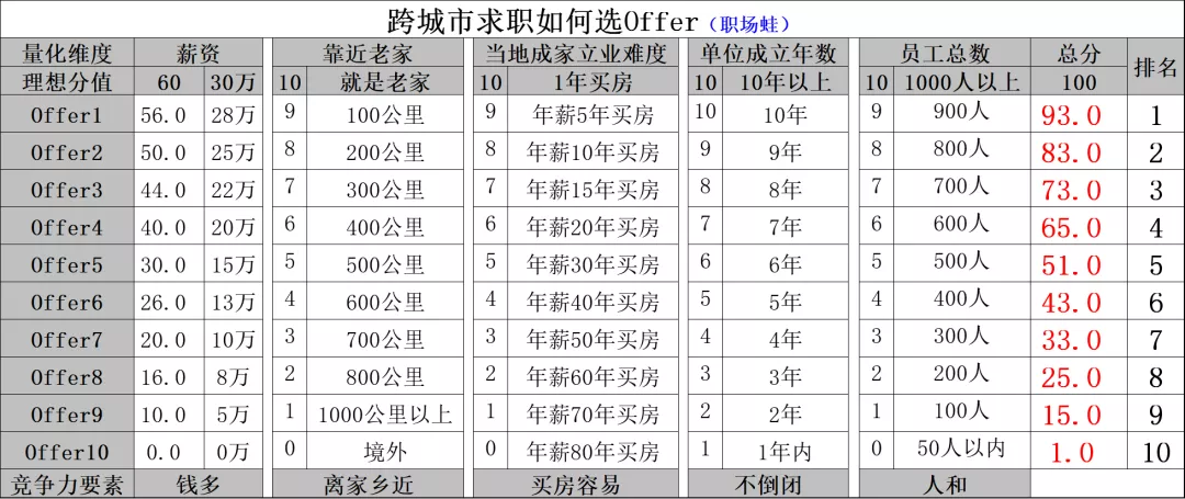 你看下表,畢業多年,還要換城市或者離家N多公里去謀生,如何打分呢?