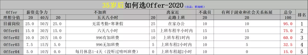 你看如下是35歲後求職的打分表。即使對於中年人來說,薪水的權重進一步降低,但也僅僅是將主業副業發展空間、離家遠近、不加班等相對可以量化的要素拔高了而已。