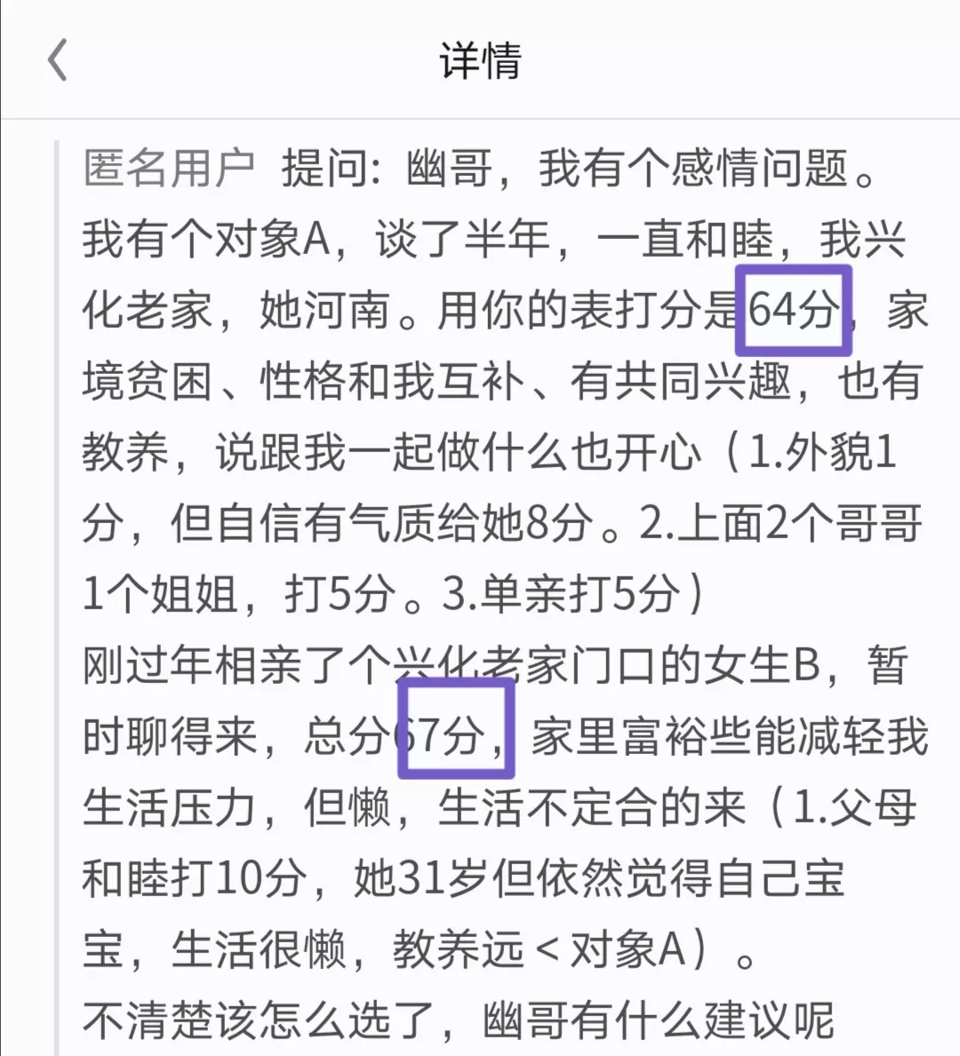 我們再看下一位,這位就是犯了原則性錯誤。相同或者類似情況下,才能做比較。他給自己目前談了半年多的女朋友打分,然後給過年期間相親的一個女孩打分,結果算出來女朋友比相親對象少了3分。他就猶豫不決,不知道選擇哪一個。