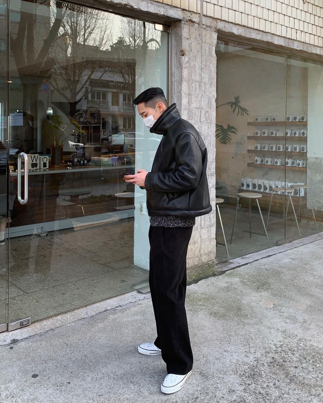 短款夾克外套也是冬日裡男生很好的穿搭選擇,這種夾克因為版型比較短,衣腳大概在腰部的位置,因此男生穿起來就有一種提高腰線的效果。上面這套穿搭整體顏色比較統一,版型也很合身,看起來就特別和諧。