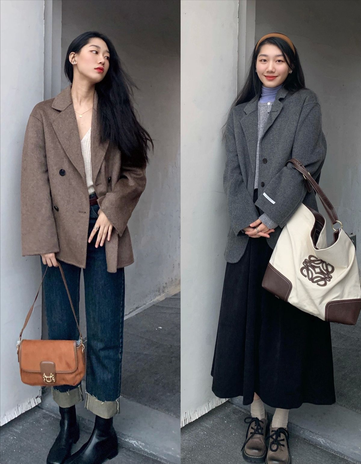 • 咖色毛呢西裝配中藍色牛仔褲