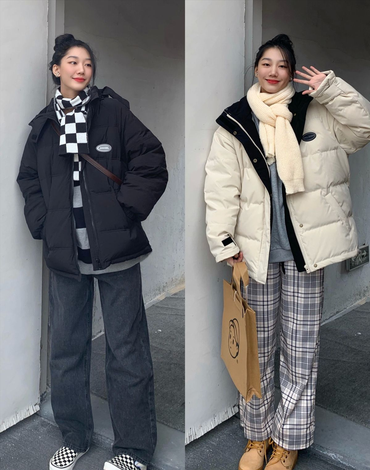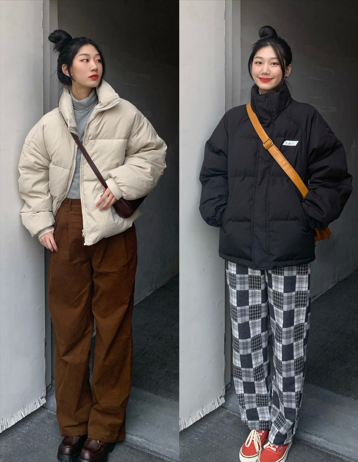 • 奶杏色棉服搭配格紋闊腿褲