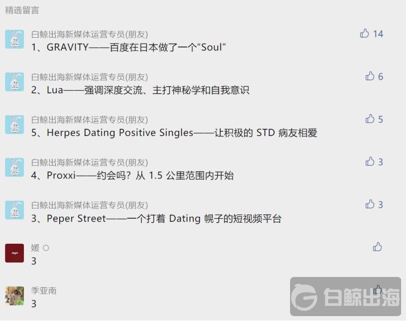 第 14 期新品除了在白鯨出海官網以及Line公眾號發布,同時也被 36 氪等媒體平臺轉載,筆者在做用戶調查時發現,聽到很多諸如「百度做社交有些冒進」、「Soul 模式在國內雖然有一定認知度,但搬到日本感覺不靠譜」、「百度造車剛有一些進展,怎麼又分散精力到社交賽道了,還是海外市場」等聲音。