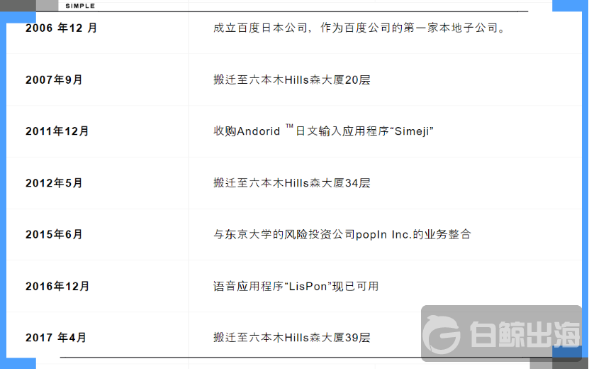 根據百度日本官網消息,早在 2006 年 12 月百度就在日本東京成立了百度日本公司,這也是百度在海外的第一家子公司。盡管百度於 2015 年關閉了百度日本搜尋引擎業務,但百度的日本觸角從未消失。