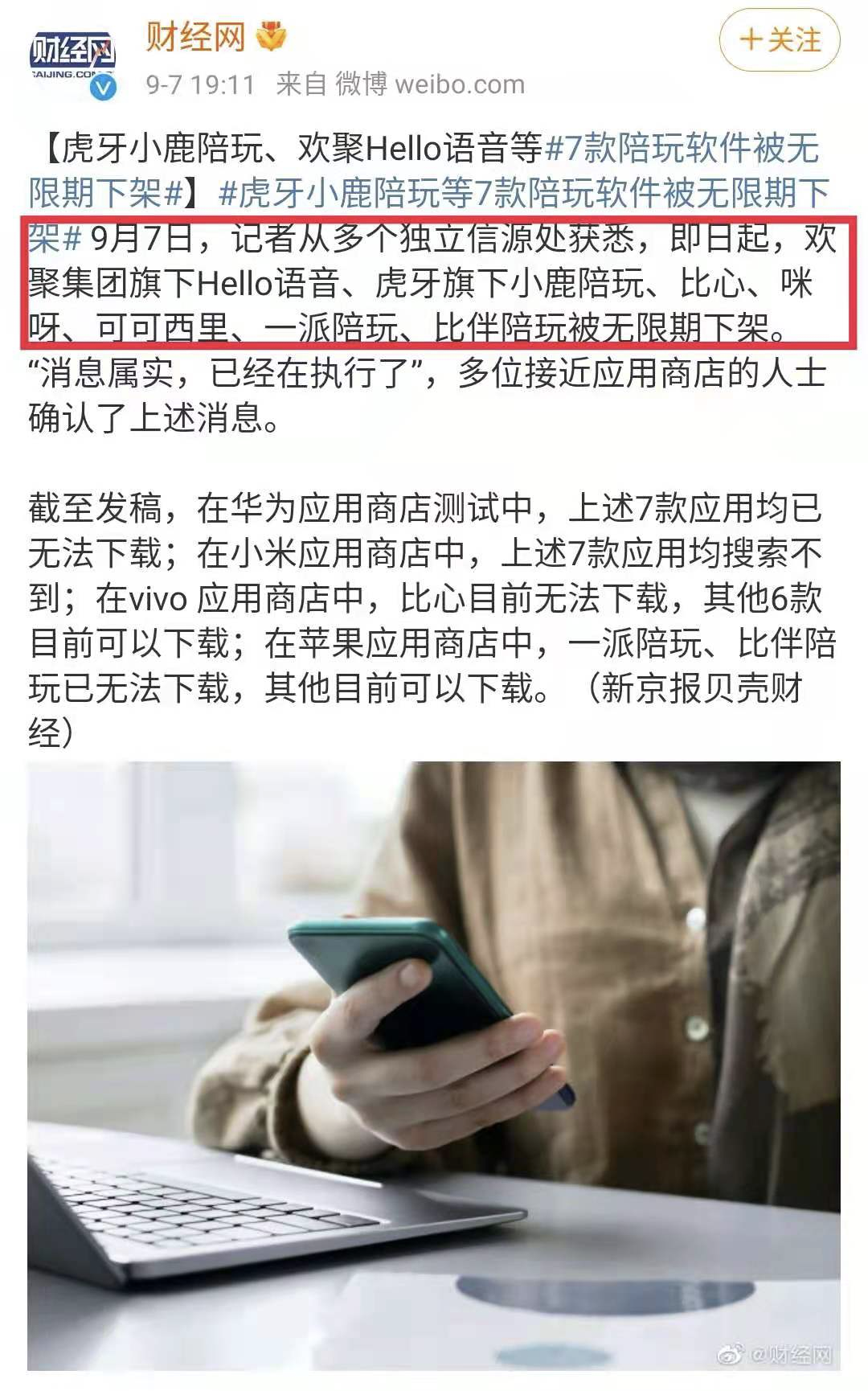比心、Hello 語音、虎牙旗下的小鹿陪玩、咪呀、可可西裡、一派陪玩、比伴陪玩這 7 款陪玩 APP 被無限期下架了。