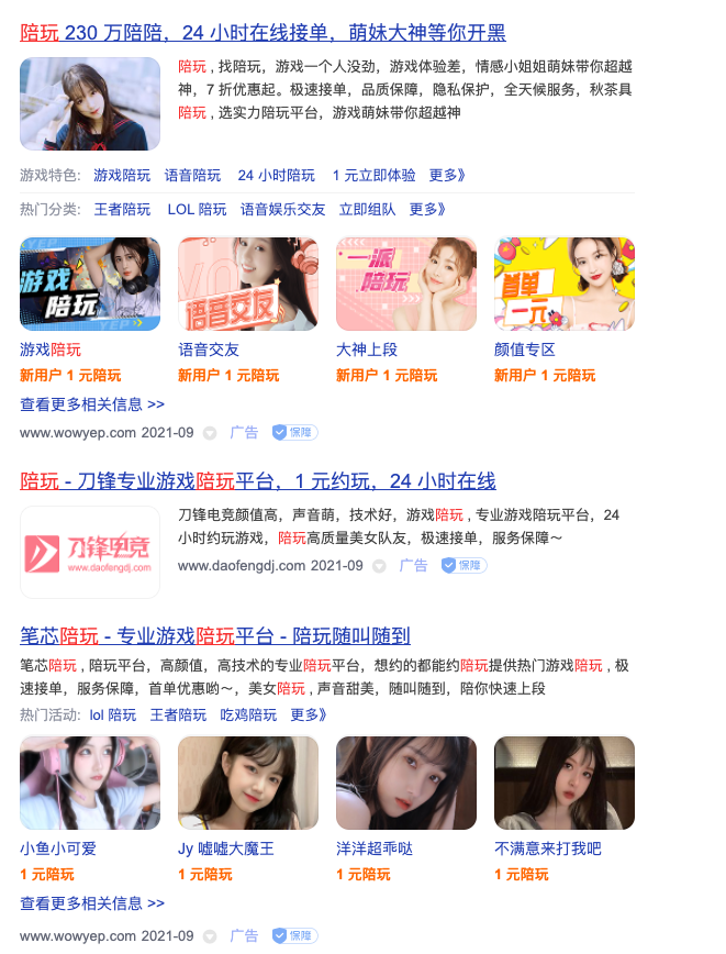 現在,隨便百度一下,還是能看到大量的陪玩廣告,