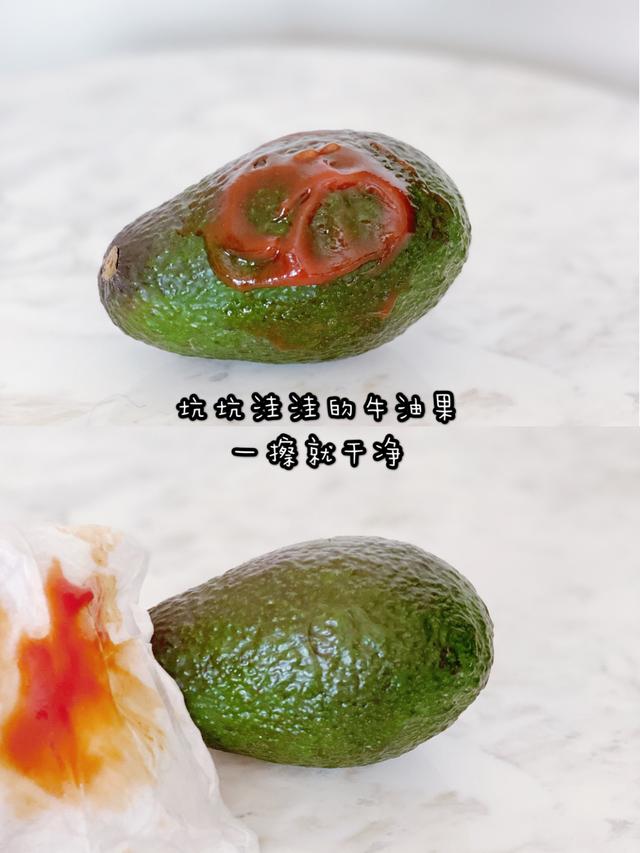 它的清潔效果要比幹紙巾好得多。以擦拭牛油果上的番茄醬為例,表面坑坑窪窪的牛油果,一擦就乾淨了。