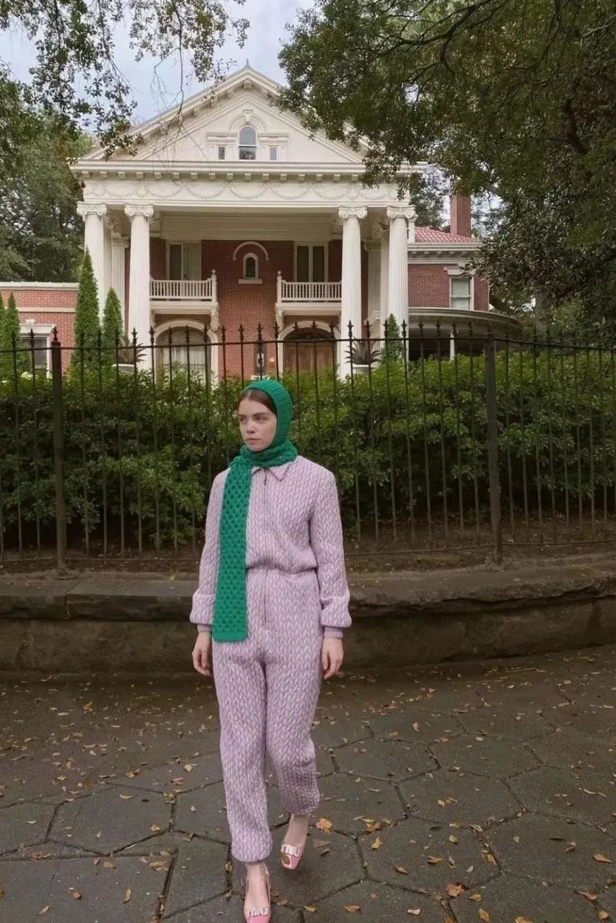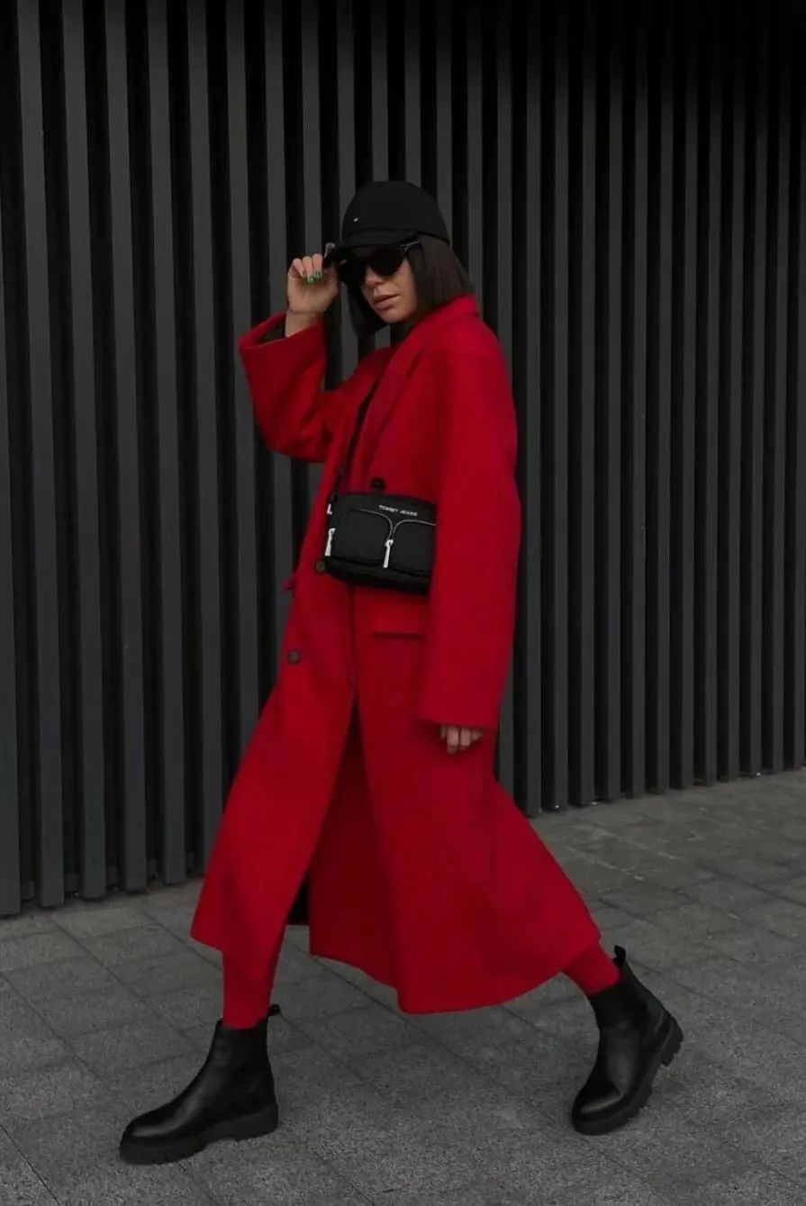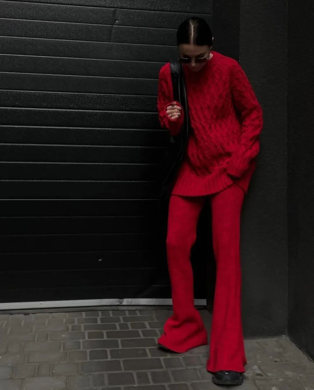 紅色系針織套裝常因色彩過於喜慶而讓人望而生畏,但如若在版式廓形上稍作調整,便能收獲不一樣的驚喜。垂感較強的拖地喇叭褲與長款毛呢大衣皆可在視覺上拉長身形,搭配黑色切爾西靴及墨鏡,氣場瞬間拉滿。