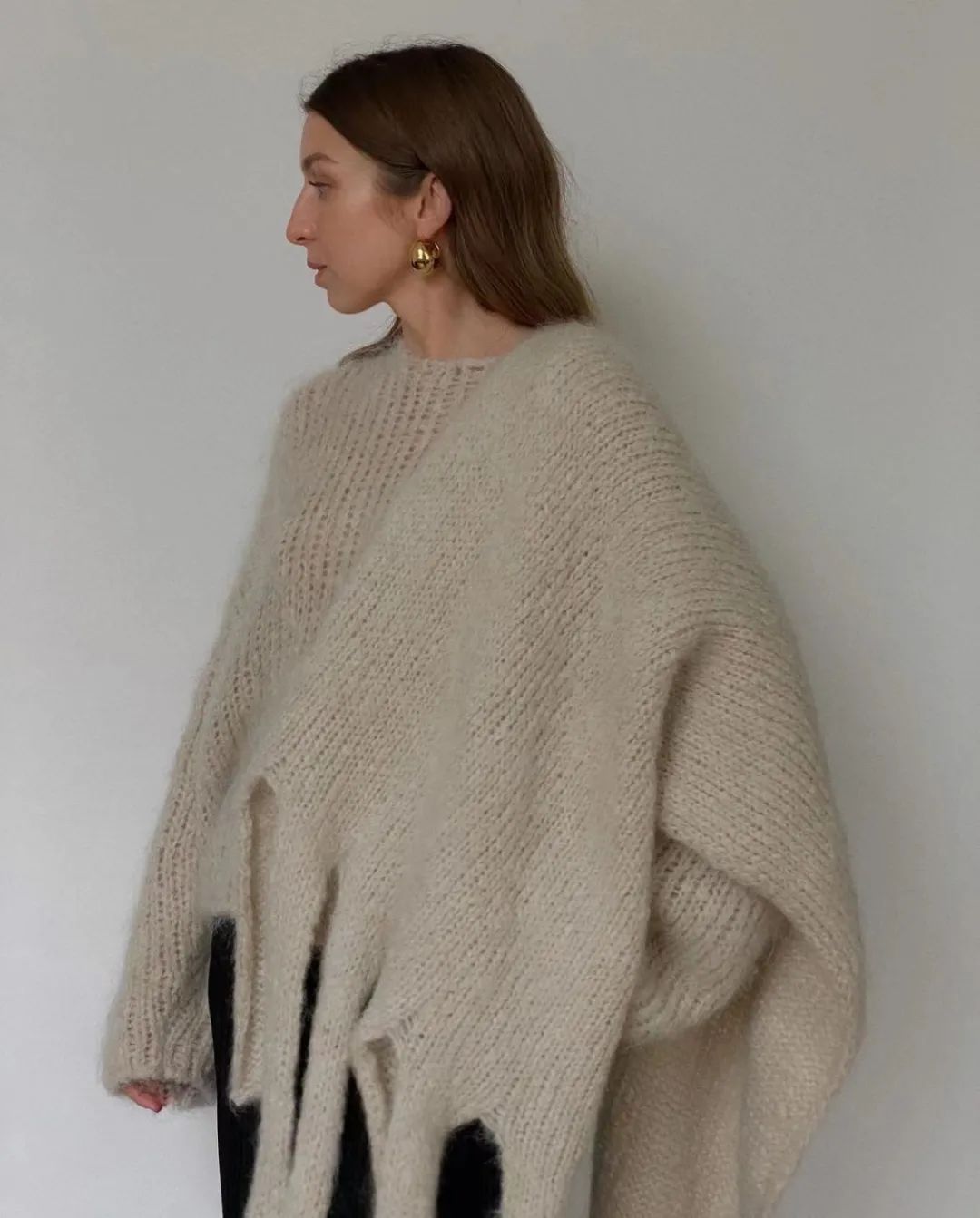 如果想要氣氛更加輕鬆一些,一襲杏色針織套裝便能夠勝任。此類低飽和度色調十分便於掌控,可在冷暖調間靈活變動。膚色偏黃的姐妹可以考慮選擇偏冷灰色的款式來調和面部狀態。