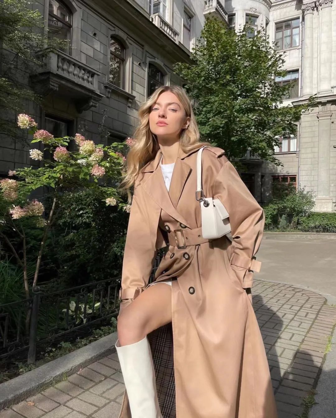 卡其色毛呢大衣與風衣外套是獨屬於冬季的浪漫,以修長廓形抓住優雅命脈。乳白內搭的適當介入能夠弱化卡其色與深咖色的生硬對比,以擴充色階的方式展露豐盈的層次感。