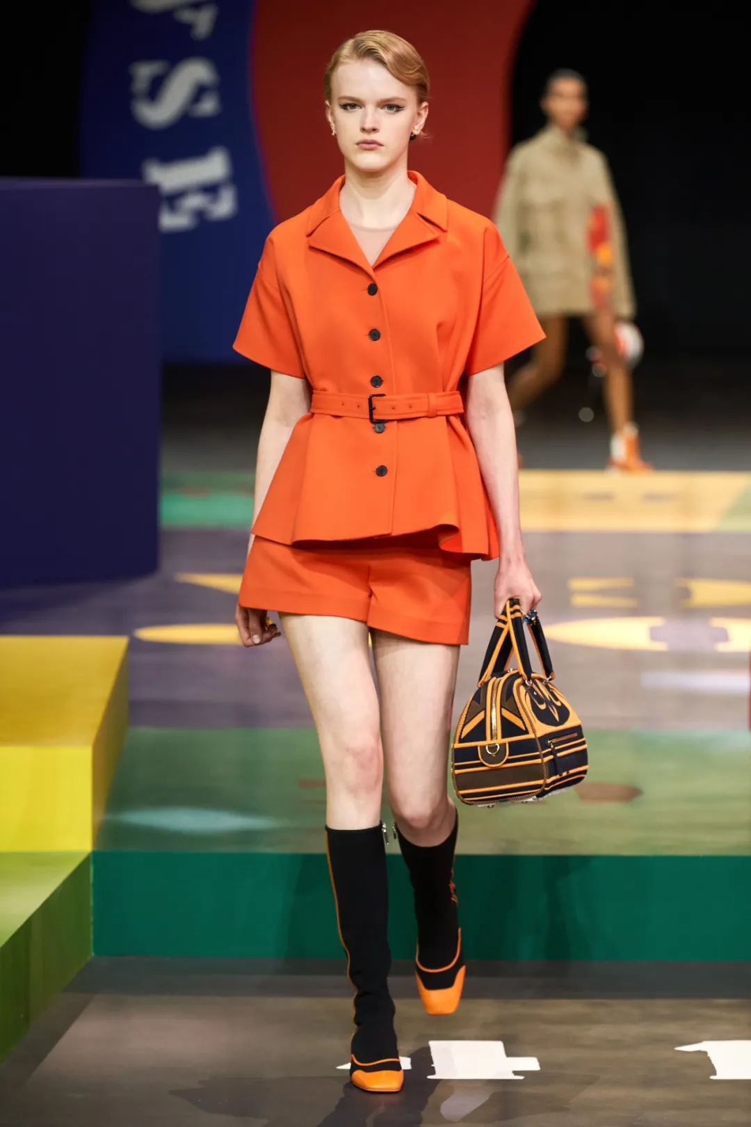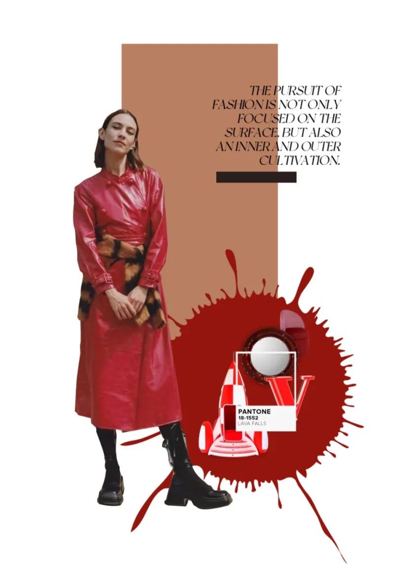 PANTONE2021-2022年度流行色熔巖流紅(Lava Falls)如火山熔巖般炙熱。持有光澤感的同色長款外套在氣質襯托上稱得上是一把好手,腰帶的選擇為整體造型帶來點睛之筆,在勾勒身材比例的同時以橙黑條紋彰顯出動物般的野性。