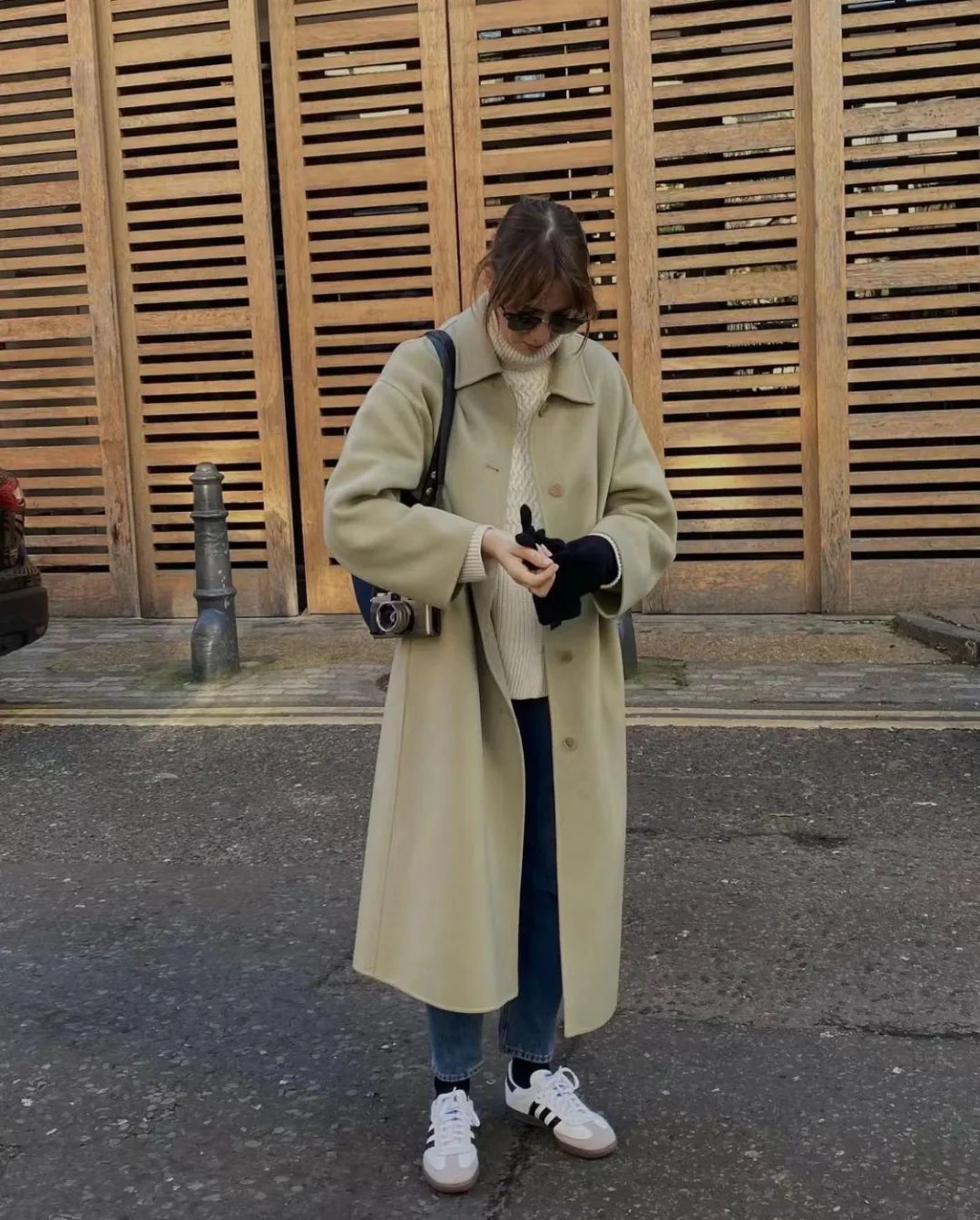 也可嘗試將整體灰度拉大,以淺豆綠色毛呢外套與丹寧相搭,展露一手文藝架式。在溫度較為溫和的南方,長款大衣算得上是最能叫車冬季單品,無論修飾身形抑或禦寒都堪稱完美。
