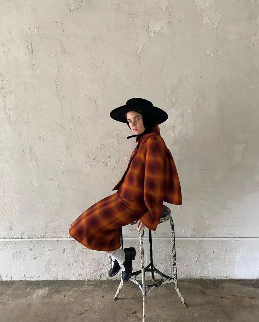格紋元素與橘褐色堪稱絕配,在弱化視覺沖擊力的同時提升了整體造型的層次感與記憶度。這個時候若是再點綴一頂黑色禮帽,腳踩瑪麗珍鞋,一定能夠將復古氣質妥妥拿捏住。