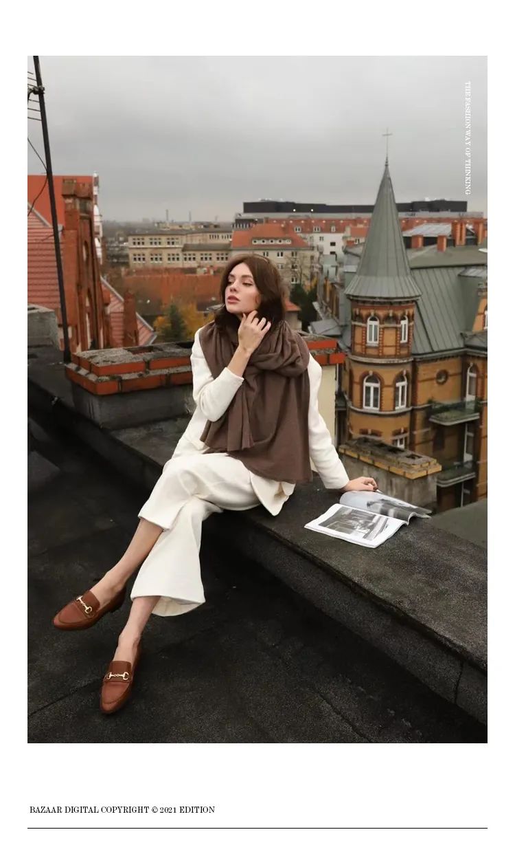 延續晨間早餐的配色風格,用一襲白衣搭配深褐色圍巾,更是別有一番風情。對比分明的色彩讓人聯想到杯中奶泡與咖啡豆的醇香,分分鐘打造出精緻Effortless Chic。