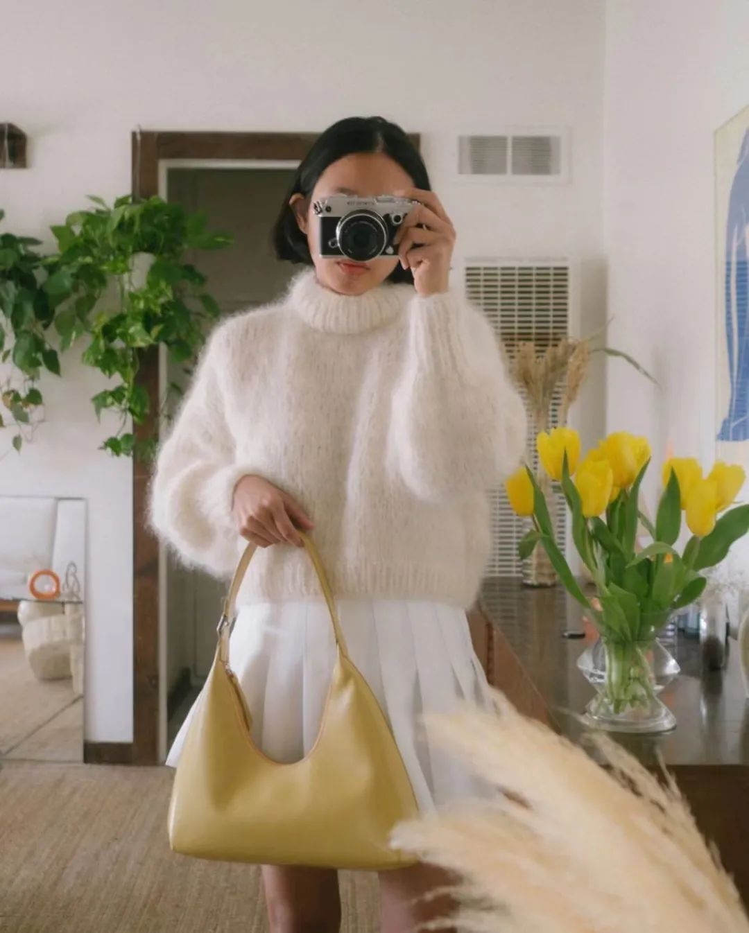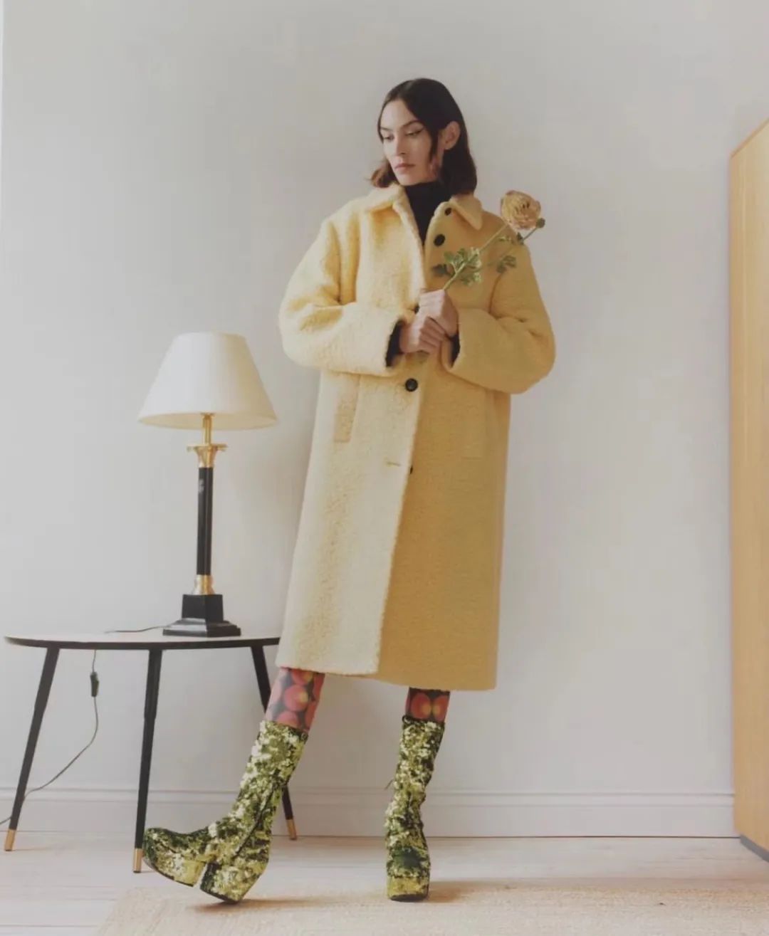 極簡的包型配上一抹淡黃,像是把月亮拎在了手裡,能夠達成提亮整體造型的視覺效果;鵝黃色大衣較為稀有獨特,但需要內搭修身上裝才會不顯臃腫。