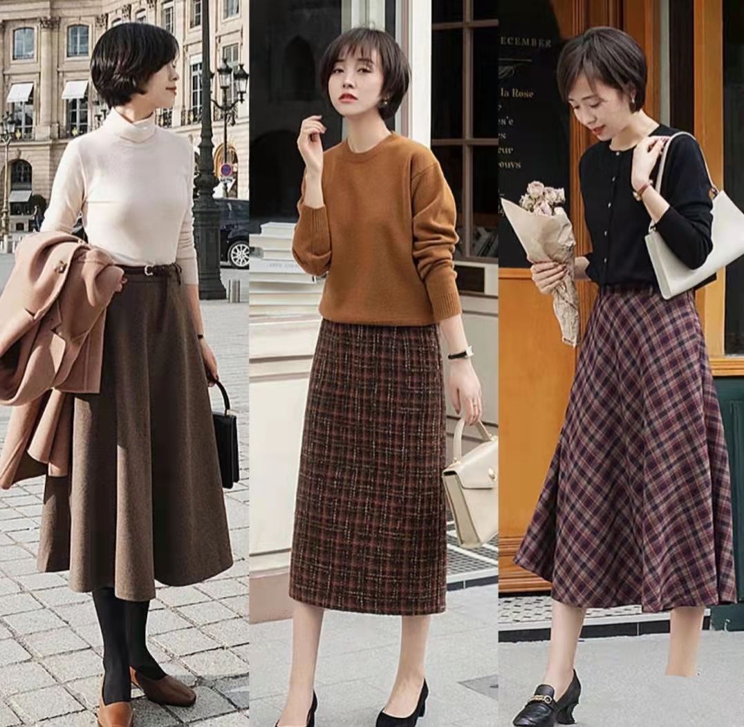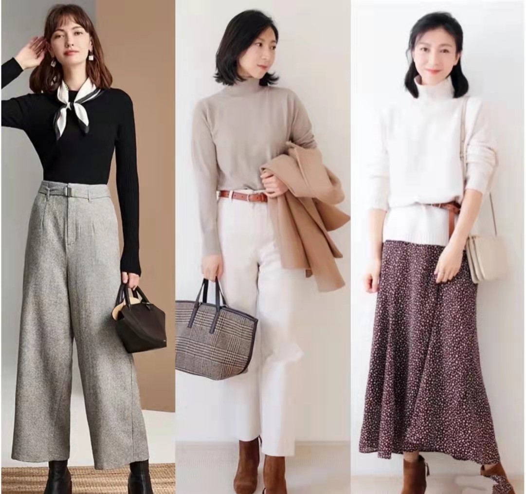 像米色、白色、咖色半高領毛衣,又或者黑色、棕色、復古紅色毛衣,強調著裝的溫柔感不說,也能通過短款版型來調整身材比例。