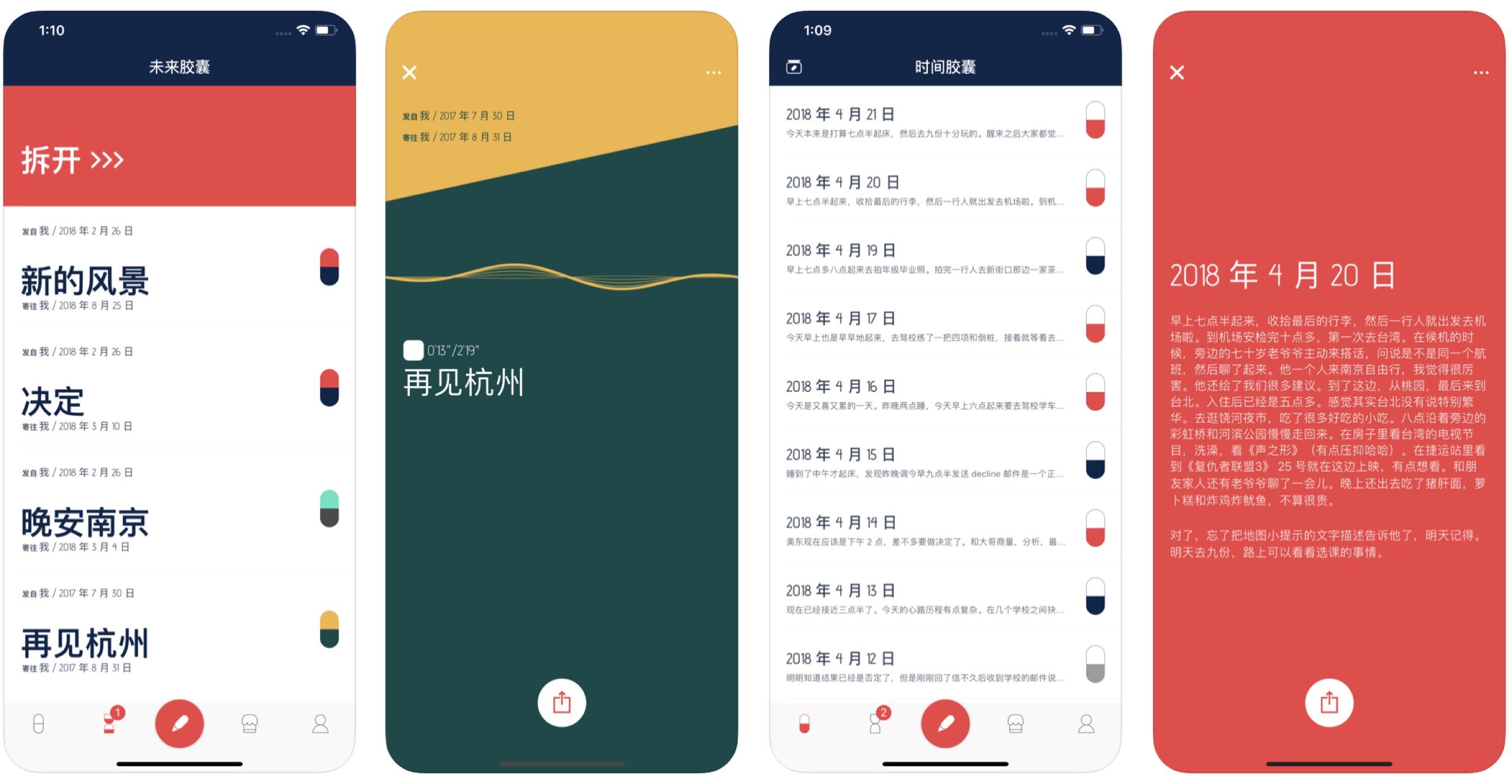 這是一款日記應用,把今天與她/他在一起發生的事情存放在膠囊裡,也能寫給未來的我們。膠囊不僅可以存放文字,還能存放語音。膠囊越來越多,回憶也越來越多。讓我欣喜的是可以通過搖晃手機,與往昔時光不期而遇。