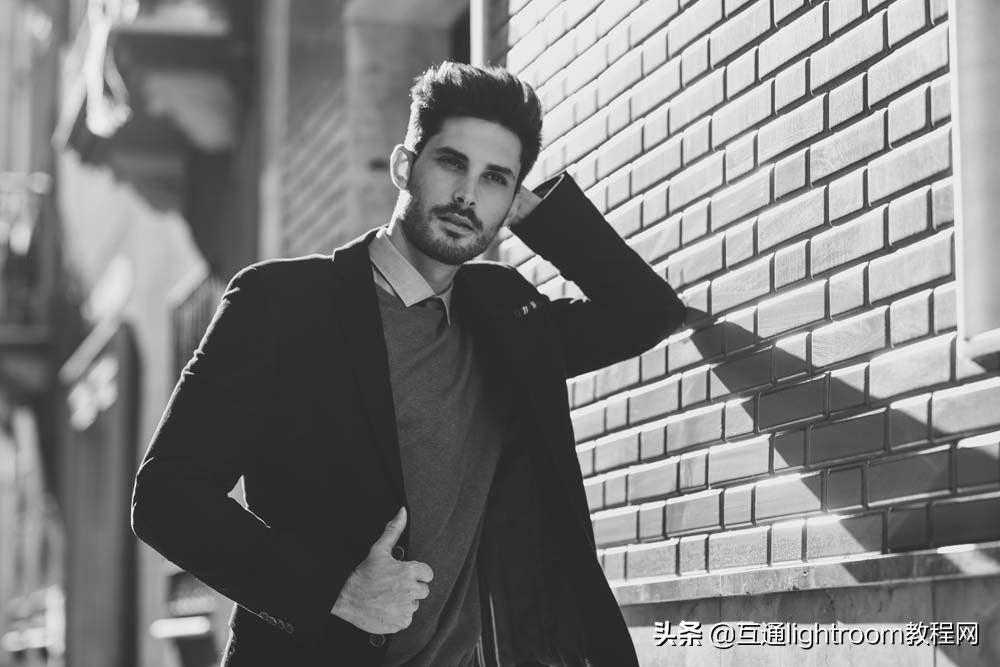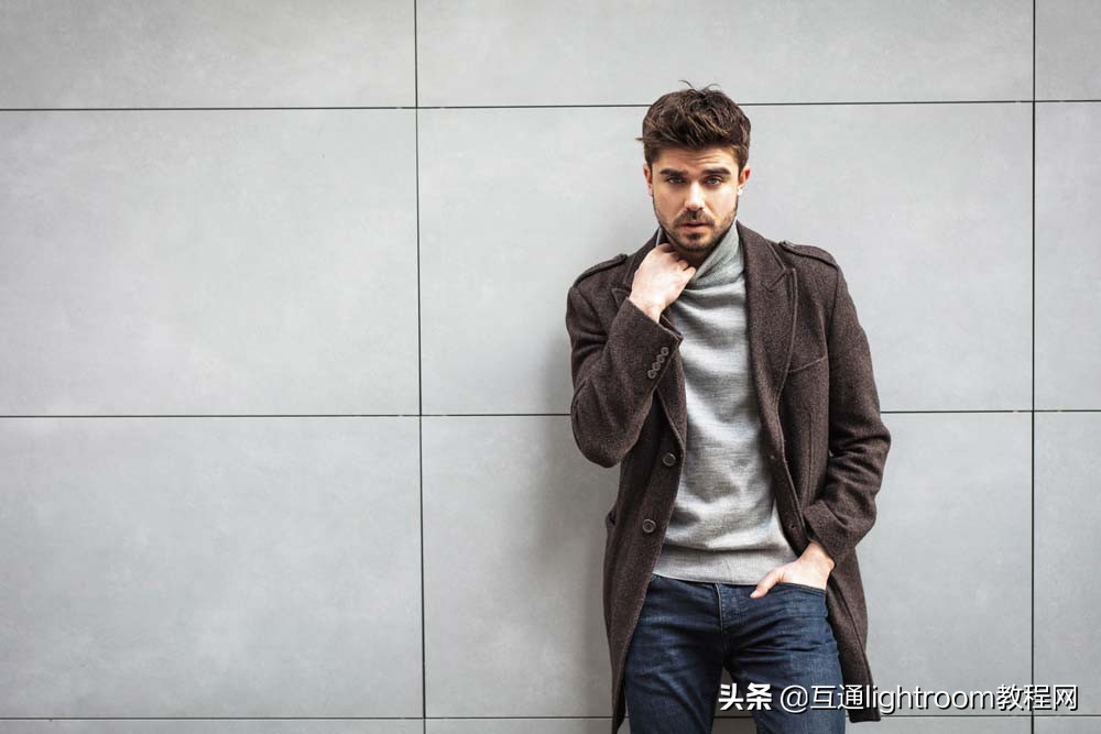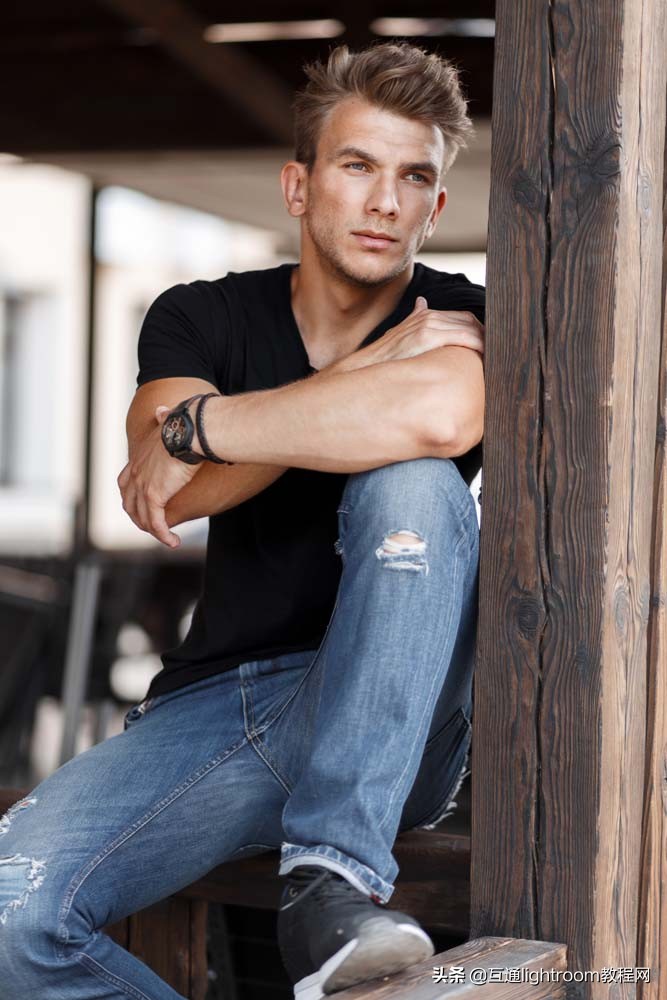 8.面對鏡頭,男性肘、腳靠向牆的一側,讓男士的臉一側通過陰影讓輪廓更黑一點,不需要微笑,也不需要盯著看相機。