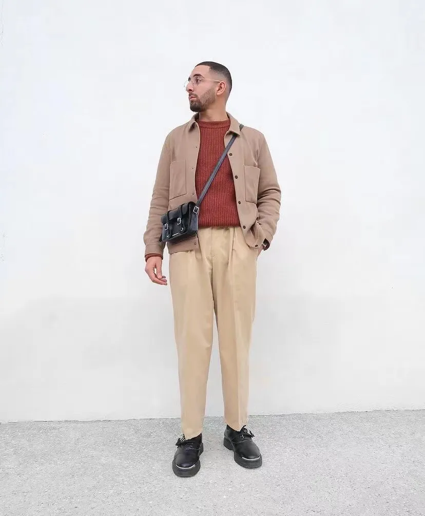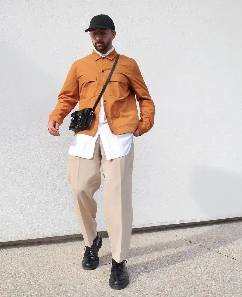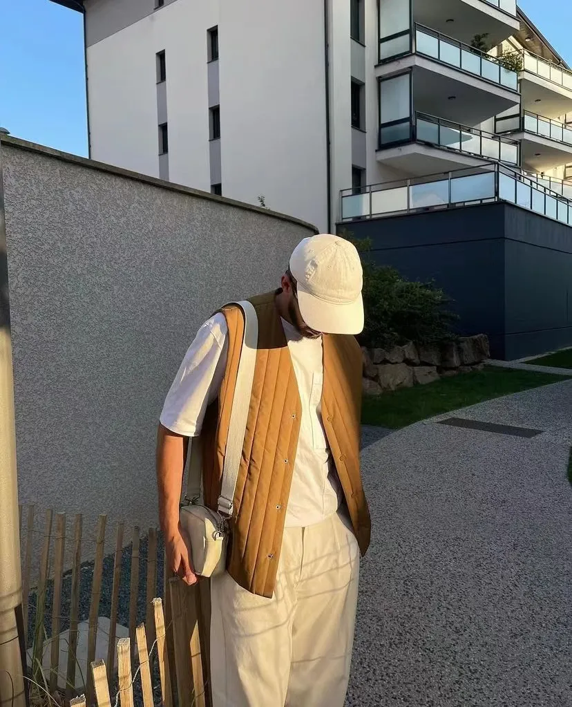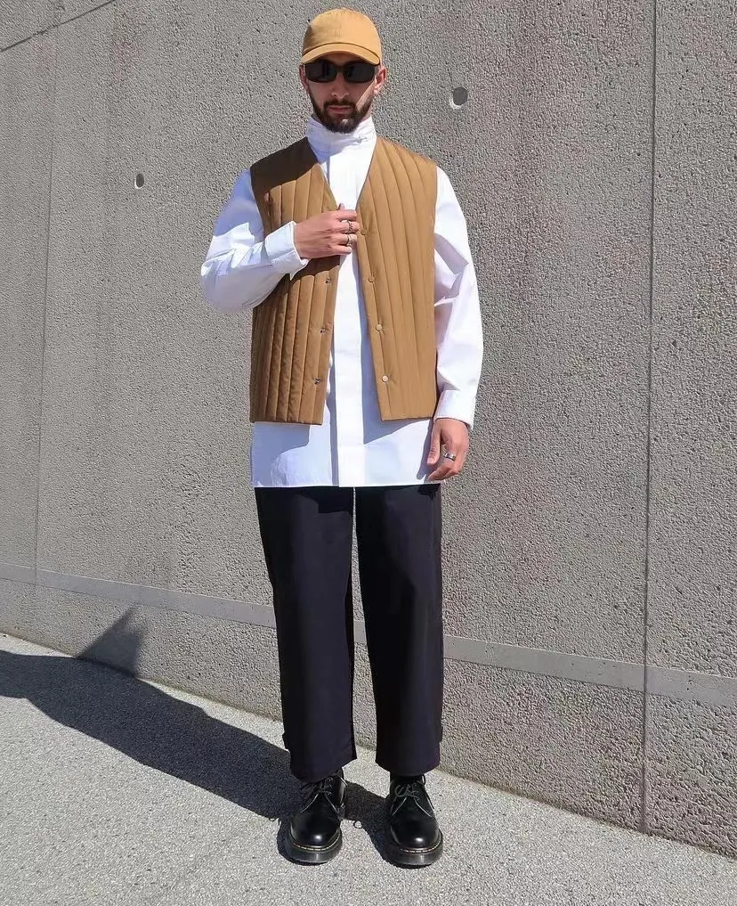 米色與淺卡其是常見的顏色,但長期穿這兩種淺色多少會顯得有些許的單調,這個時候在外面披一件版型立體的橙棕色馬甲,會讓整個人顯得更加活躍,有精神,又不至於太浮誇。