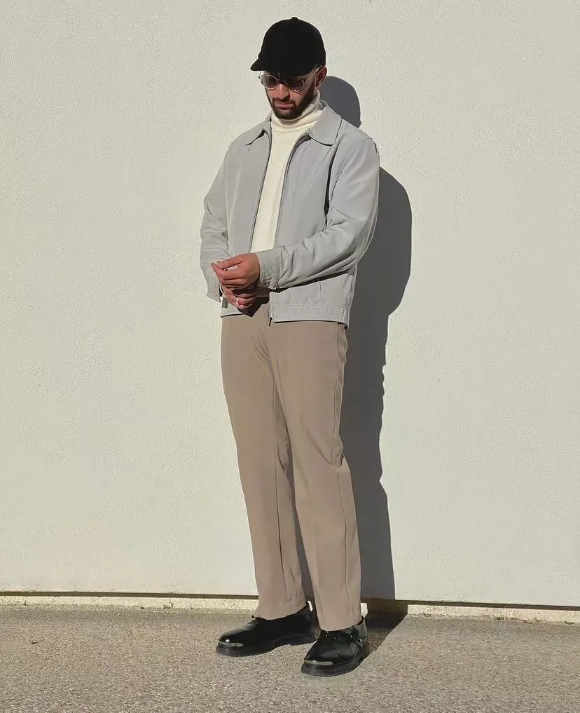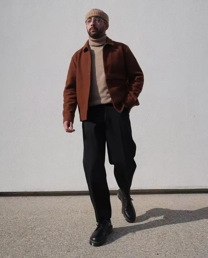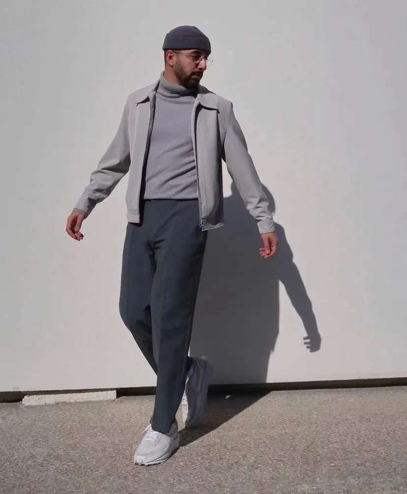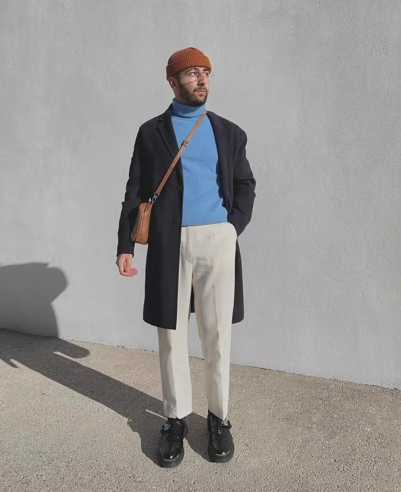 外面配一件灰度適中的短款夾克,不但可以拉高比例,又不會顯得拖拉。如果是再冷一些的時候,高領針織衫內還可以穿一件保暖內衣,畢竟要風度的同時,還是要注重一下溫度,否則就是為了穿搭而穿搭。