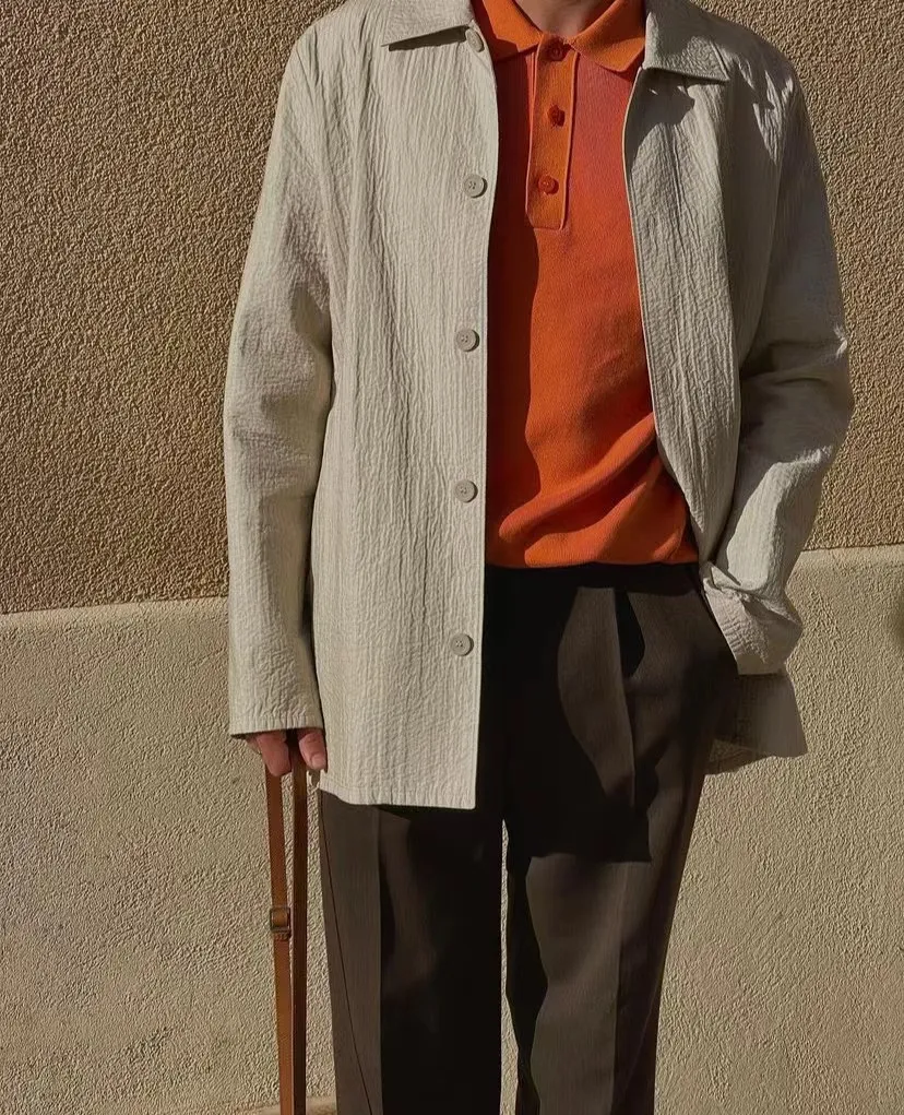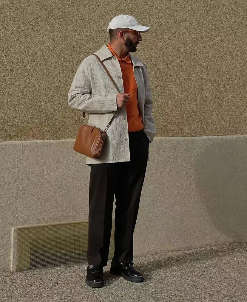 因為 Polo 衫似乎總是被貼上「老氣」的標簽,但實際上很多一部分原因是因為沒有選對合適的顏色與款式。像這樣用深灰色的西褲與白色的外套作為主色調,內露一件橙色的 Polo 衫,輕鬆營造出一種輕熟的感覺。