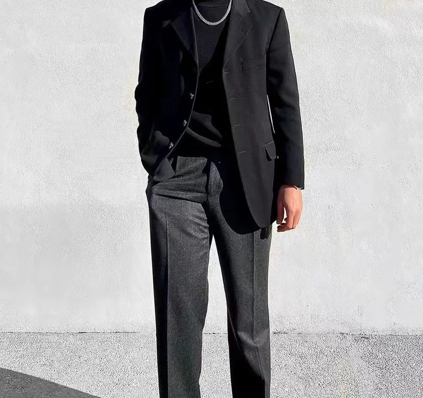 西裝外套就一定是商務、嚴肅的代表嗎?我覺得未必,只要我們不要上下同色,上半身選擇一件寬鬆的西裝外套,下半身用一條稍淺一點的西褲,加上一些配飾,痞帥的感覺就出來了。