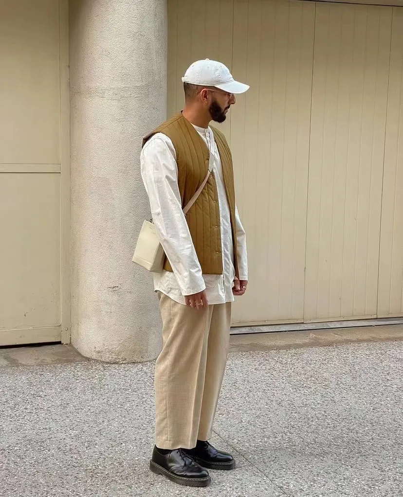 白色襯衫上衣與深色西褲,難免也會顯得有些商務,甚至還會和銷售,廚師撞衫,但同樣是選擇一件棕色的馬甲,再用一頂棕色的帽子點綴一下,時尚度直接拉滿。
