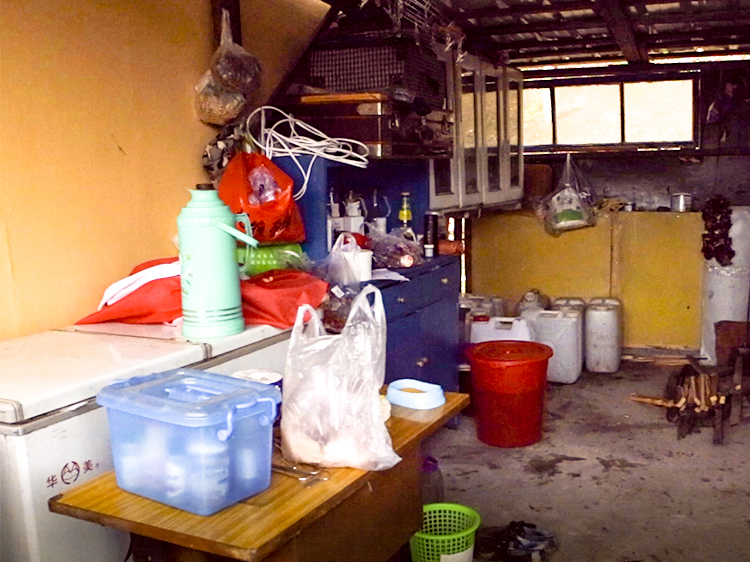 可能是考慮溫差,窗戶用塑膠布代替玻璃。房裡堆著幹糧和油。牆上掛了外套、水壺和做菜吃的蘑菇。雖然地裡種了一些菜,但食物還是需要被送上山。蔬菜主要是豆角番茄,更容易儲存。北地往往飲酒取暖,但這份工作日常禁酒,免得誤事。同行的工作人員帶了些豆皮和鴨腿等熟食,算是難得的美味。