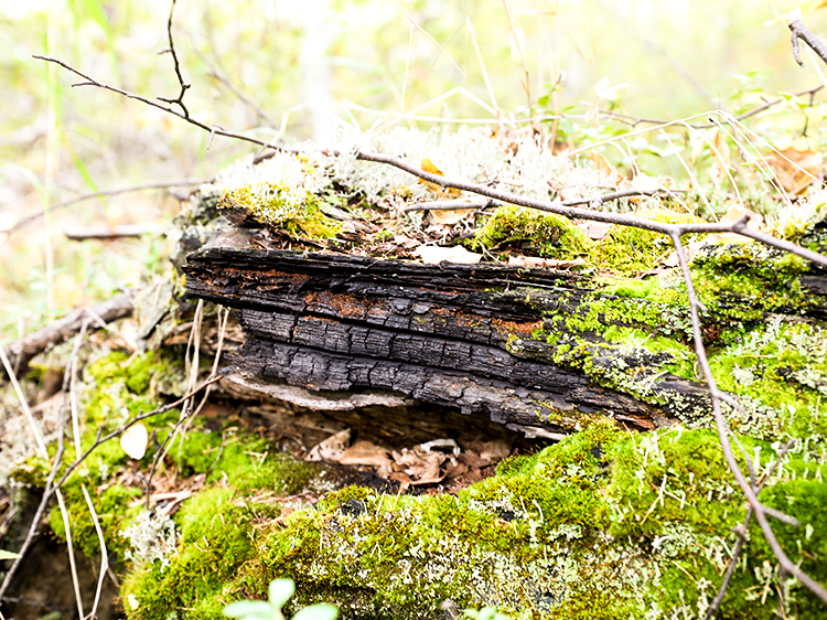 林地上燒過的樹木,已長出苔蘚。