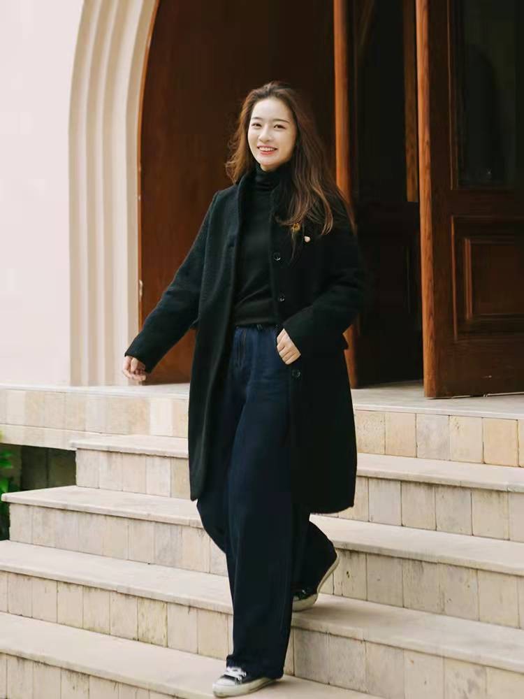 相信許多時髦優雅的女生,東西都少不了一款百搭的呢子大衣,黑色系的呢子外套是最佳選擇,不僅顯白還特別顯氣場,內搭選擇黑色高領毛衣,同色系搭配,隨性又大氣,下身的高腰牛仔闊腿褲形成了休閒酷帥的風格,特別的時尚幹練。