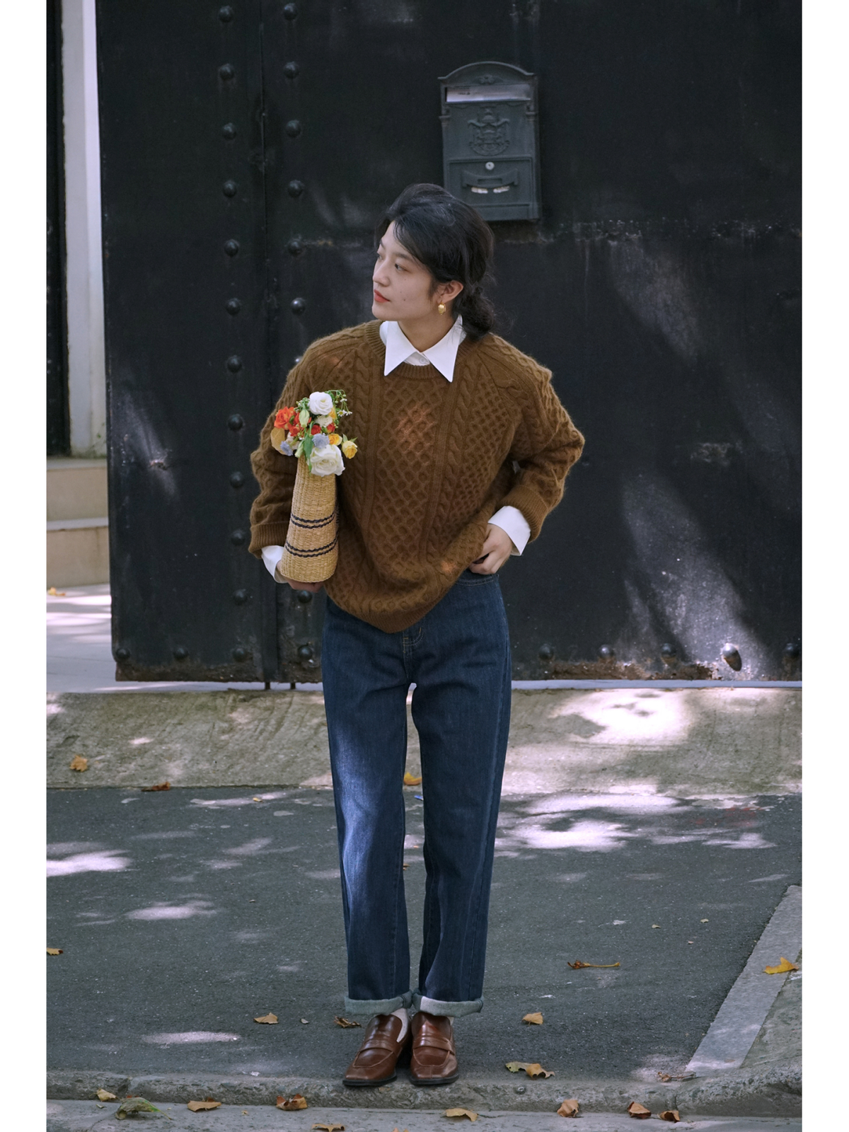 冬季是一個流行疊穿的季節,這款復古的棕色編織毛衣,配上內搭的白色襯衫文藝又清新,成熟女性這麼穿實在是太減齡了,下半身配上藍色牛仔長褲,營造出幹練隨性的感覺,更顯灑脫魅力。