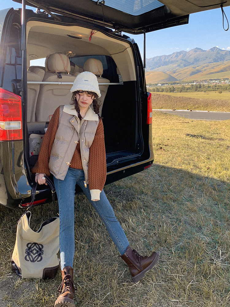 隨著年輕少女的穿搭風格,是當下流行的活潑可愛的鬼馬少女穿搭路線,粗針樣式的棕色毛衣配上羽絨馬甲,復古隨性,下半身配上緊身牛仔長褲和棕色高幫馬丁靴幹練酷帥,還特別顯腿長,頭上的白色羊羔絨帽子和捲髮搭配在一起,凸顯出可愛魅力,太顯清純了。