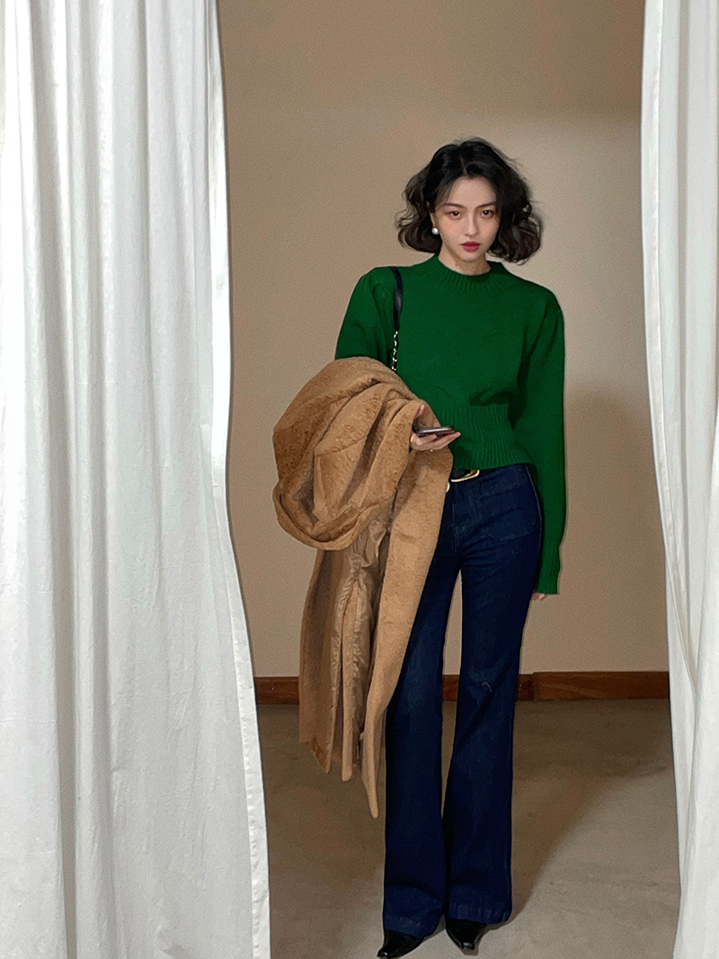 這一組look利用深綠色毛衣配上深藍色牛仔長褲,顯得高級優雅,還多了幾分復古的魅力。超短款的毛衣配上高腰款的微喇牛仔褲,凸顯出完美的腰臀比例,這麼完美的身材,是讓人不能忽略的存在。