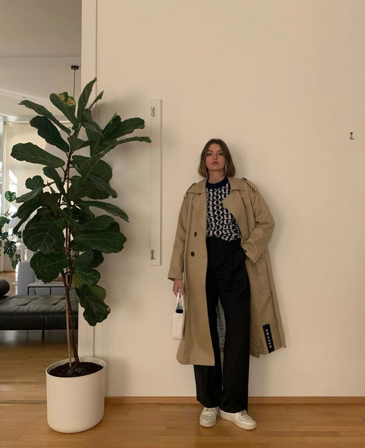 隨性大氣的駝色風衣外套是每個成熟女性都可以選擇的一款單品,作為日常搭配,如果想要搭配出幹練顯瘦的效果,內搭可以選擇黑色毛衣配上黑色高腰闊腿長褲,特別的利落幹練,還顯腿長,小個子女生這麼穿也沒有負擔。