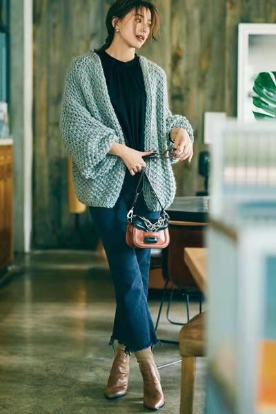九分牛仔直筒褲沒有緊身褲那樣有束縛感,又比闊腿褲更顯瘦一些,所以上半身搭配上寬鬆膨大的灰色針織開衫,也沒有任何的負擔感,因為整體的視覺效果是上松下緊的,所以非常顯瘦。腳上的淺棕色尖頭皮靴順著腿部線條形成了視覺延伸,效果特別顯腿長。