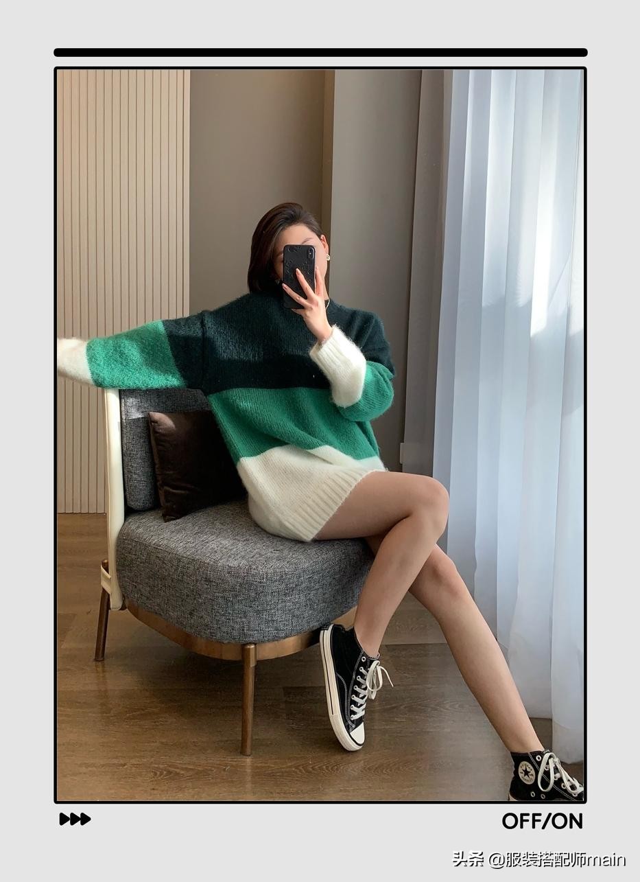 綠色漸變色的毛衣軟軟糯糯,上身明亮提升氣色,慵懶寬鬆的版型,不挑人的款式。可以穿光腿神器,打造「下衣失蹤」造型,走在街上絕對吸睛。