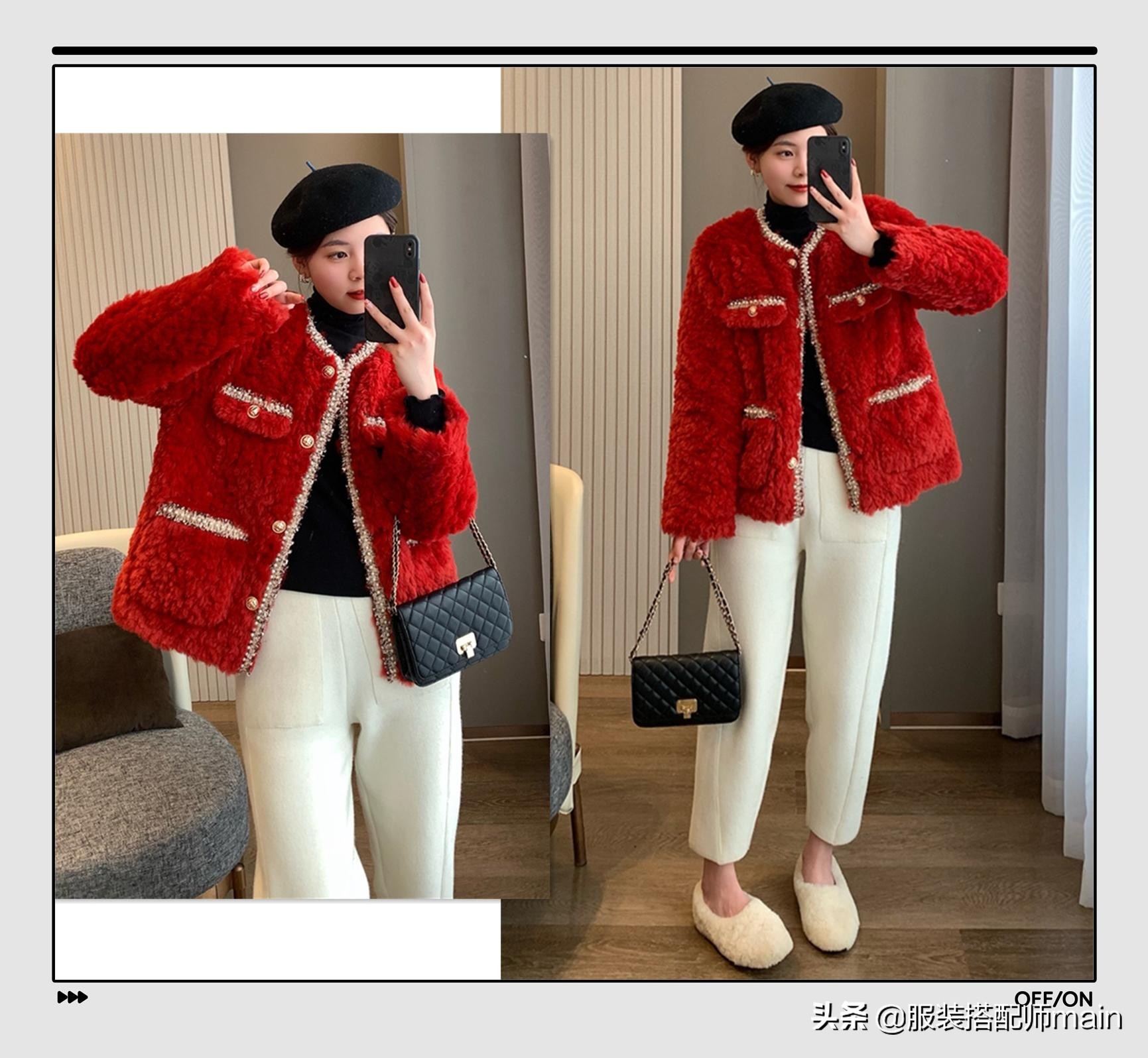 所以我選擇了一件「紅紅火火」的外套,穿上身感覺版型微寬鬆,門襟和口袋都做了立體釘珠,再加上羊羔絨面料,讓貴氣和柔軟度同時擁有。