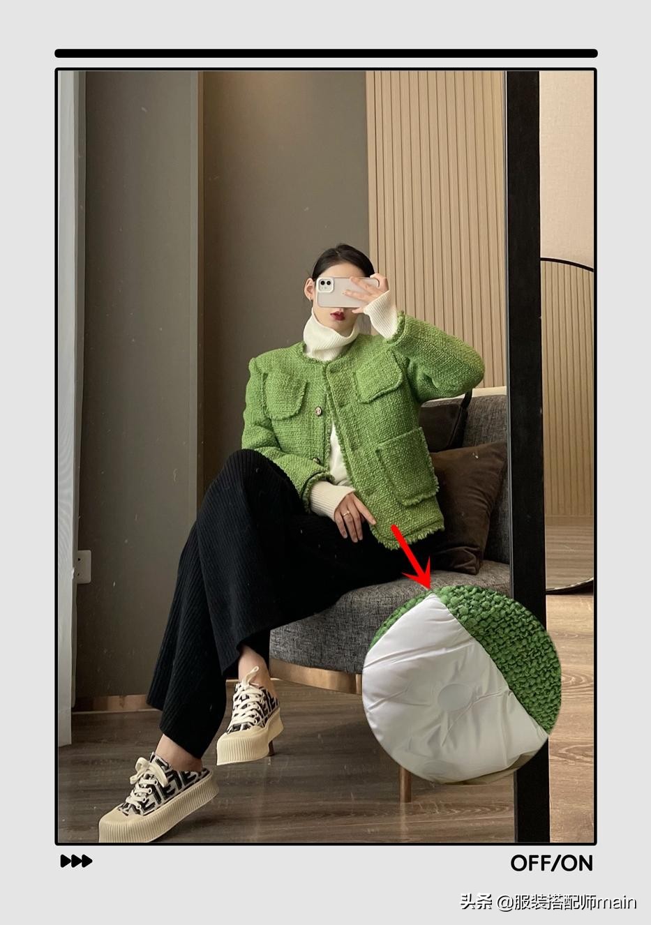 在外套裡面穿一件白色高領毛衣,既增加層次感,又可以更好地駕馭亮綠色。