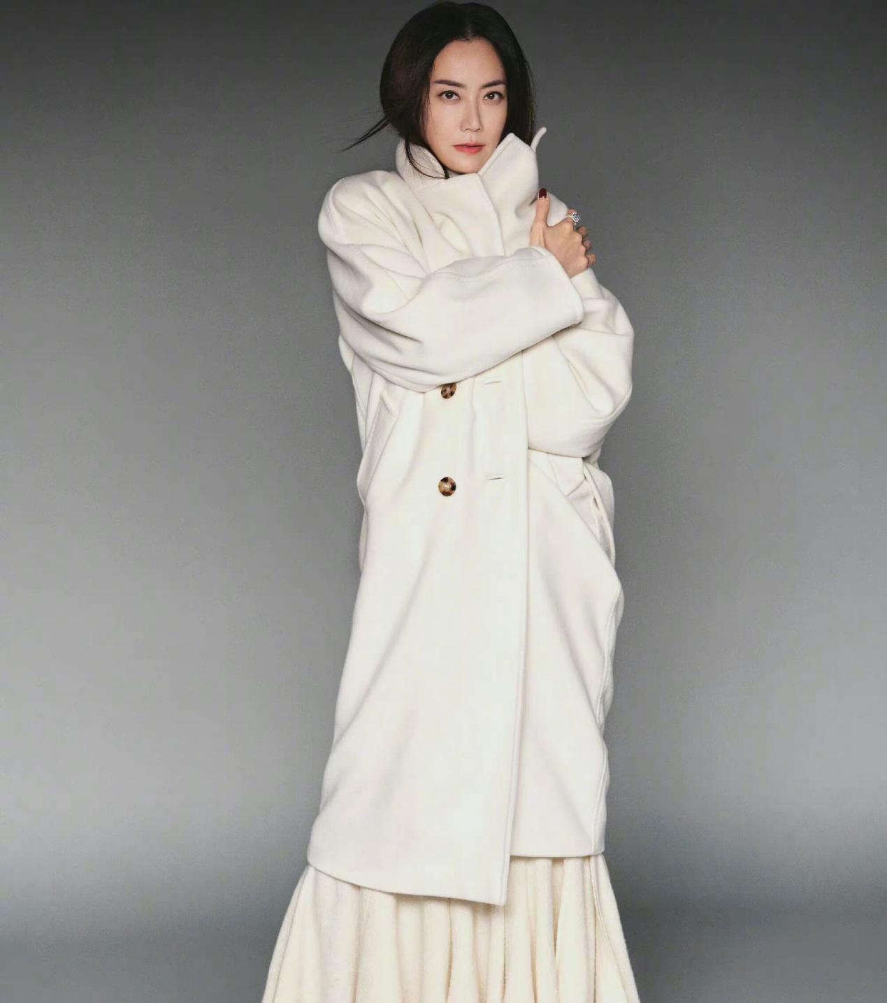 不管什麼造型都能夠大氣端莊,高貴又優雅,也難怪跟明星拍時尚大片時氣質也不輸。白色大衣搭羊羔絨長裙,精緻又幹練。還有那透著濃鬱故事感的眼神,讓人不由的想要靠近。