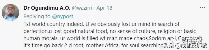 「不愧是世界第一大國。你們顯然已經失心瘋了,你們失去了良好的自然食物,沒有文化意識,宗教或基本的人類道德。你們的世界充滿了人為的混亂和罪大惡極的行為. 是時候回到非洲母親那去找找靈魂了…」