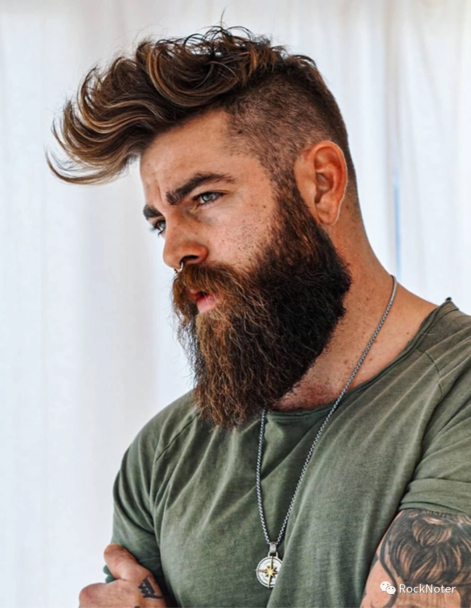 這是一款令人驚嘆的男士維京髮型。在這種風格中,狂野的頭髮伴隨著粗糙的鬍鬚。頂部的頭髮類似於莫霍克髮型。側面採用底切。