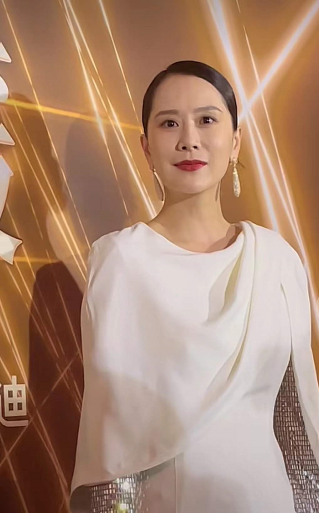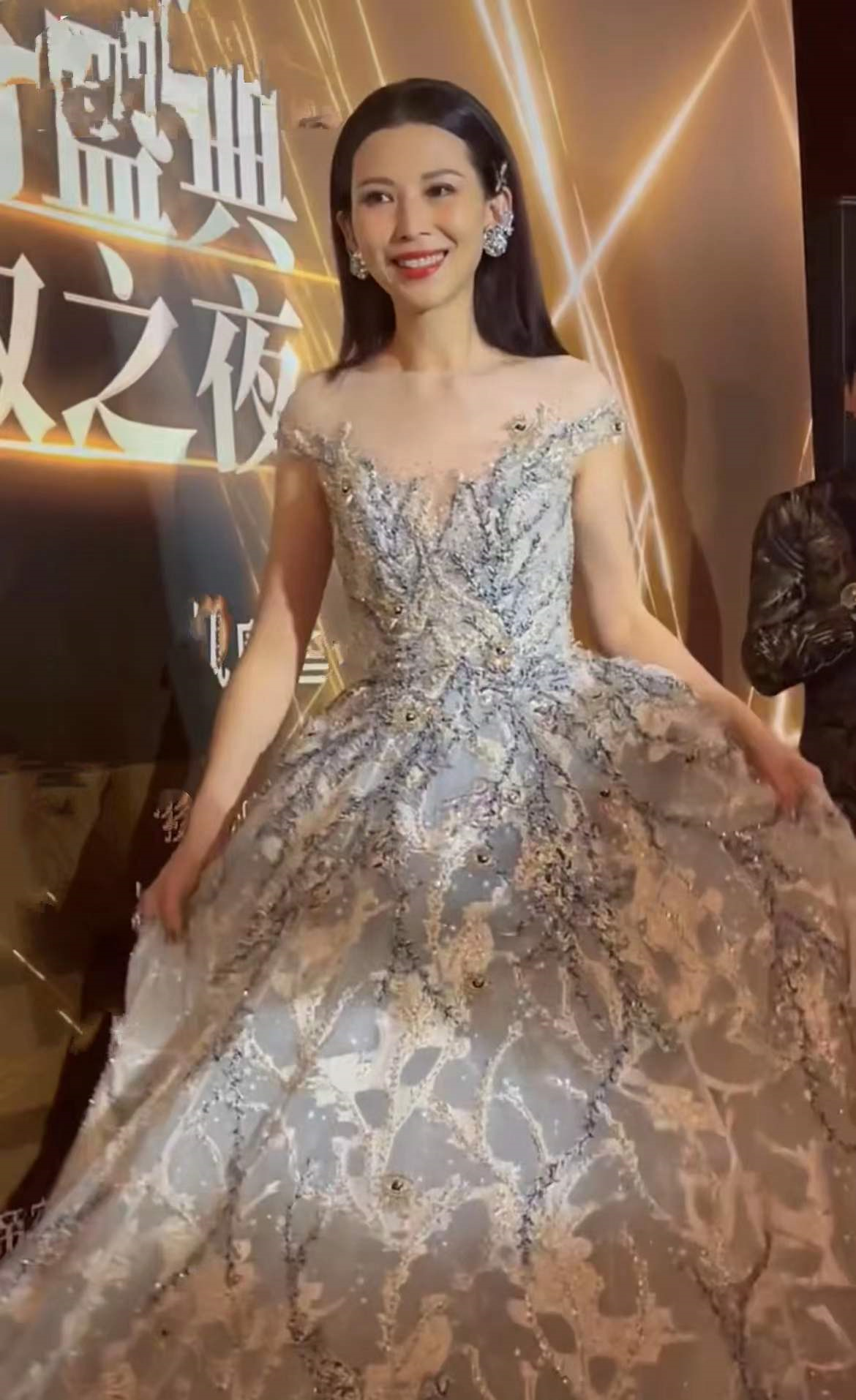 「娘娘」蔡少芬身穿刺繡深V露背長裙,頭髮披散在兩邊,身材纖細,絲毫沒有留下歲月的痕跡,一點也不像 3個孩子的媽媽。