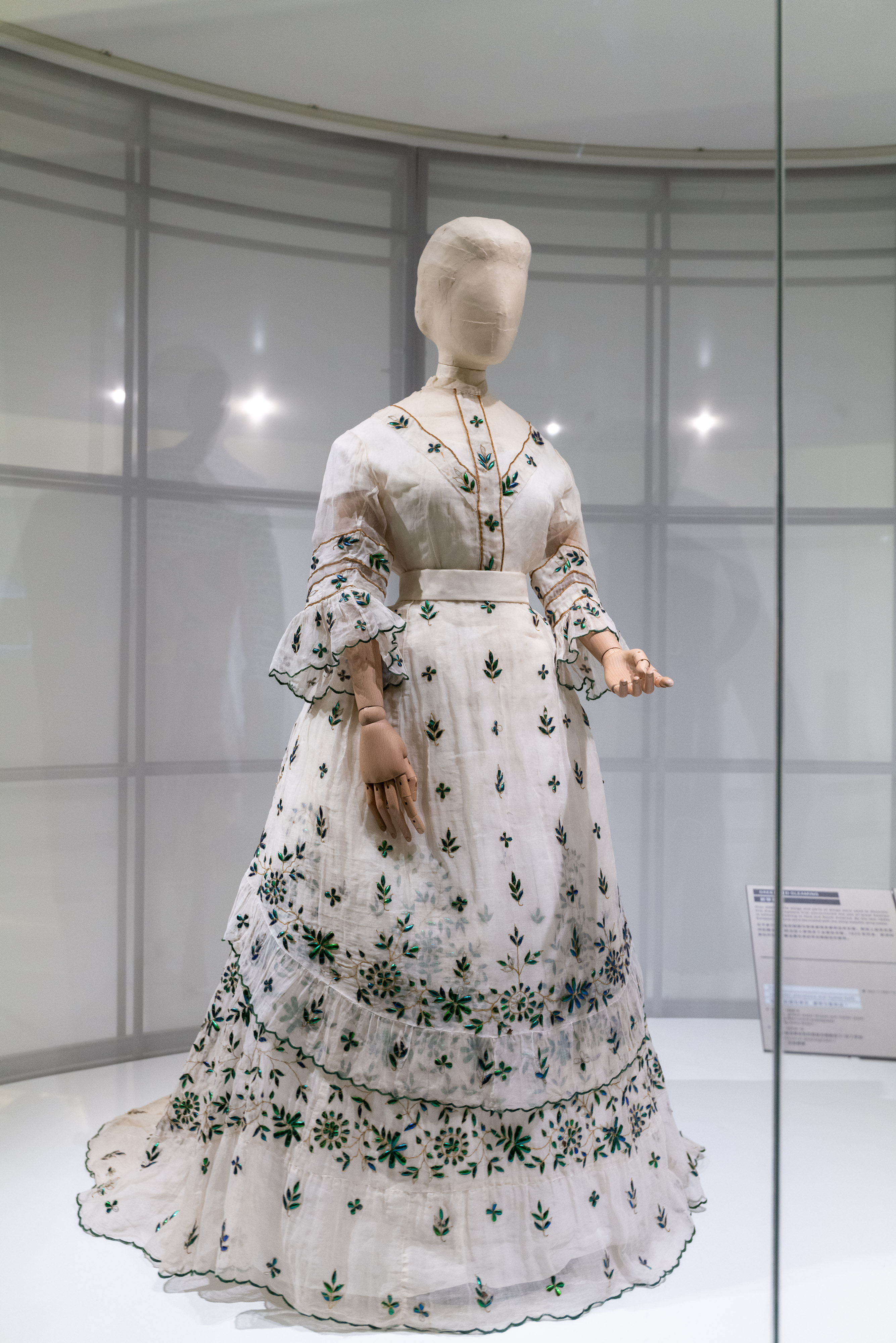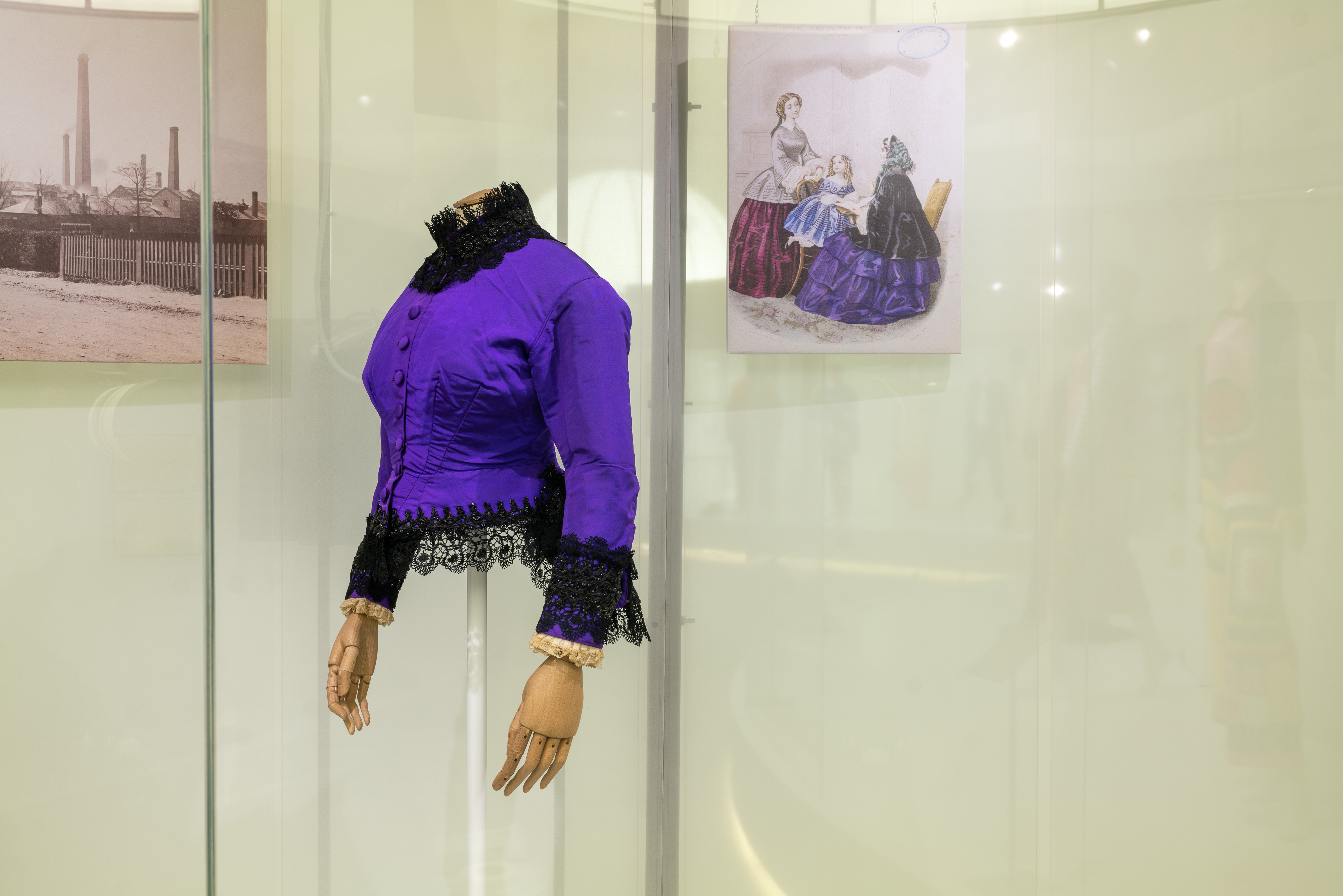 第二件是一件紫色的上衣,是1876年來自英國的緊身上衣,它是用人工合成的染料染制而成的。一位名為William Henry Perkin的年輕化學家在1856年研制出了世界上第一種合成染料。本來他是想從煤焦油的苯胺來合成奎寧,不過合成奎寧化學實驗失敗了,這種失敗帶來了意外的發現,一種非常奪目的紫色,當時的人們用他的名字命名了這種染料。但是苯胺有毒,會危害染色工的健康,如今已被禁止使用了。