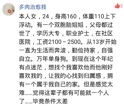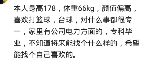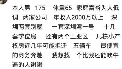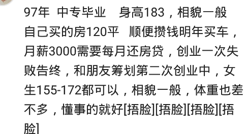 網友:想找一個單身的,戀愛經驗不多的,自愛的女生,身材胖點沒關係,不會做飯沒關係,我可以做,不會做家務沒關係,鍋碗我可以刷,但是一定要三觀正常,同時要尊重父母,文明陽光,年紀在97-96年的,不耍小性子,不矯情,不蠻不講理的懂得互相體諒的一個女生,車子,房子我來買,彩禮錢,三金我也給,前提只要你不是扶弟魔,會為以後我們的家庭著想就行。坐標徐州新沂,有意向的可以私信娜米與戀愛小秘書們